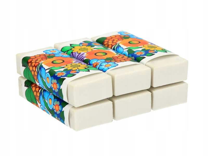 Gumka zawinięta jest w opaskę papierową ozdobioną zalipiańskim wzorem, co podkreśla jej tradycyjny charakter i estetyczny wygląd. Wymiary 5,5 x 2 x 1 cm sprawiają, że jest poręczna i wygodna w użyciu. To idealny wybór dla miłośników polskiej sztuki ludowej oraz świetny pomysł na drobny upominek.