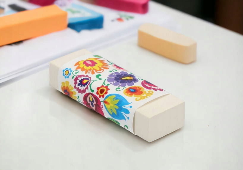Gumka jest zawinięta w delikatną opaskę papierową, która nie tylko chroni ją przed uszkodzeniami, ale także nadaje jej autentyczny charakter. To prawdziwe dzieło sztuki, które może stać się nie tylko przydatnym narzędziem do mazania, ale również ozdobą biurka lub miejsca pracy.