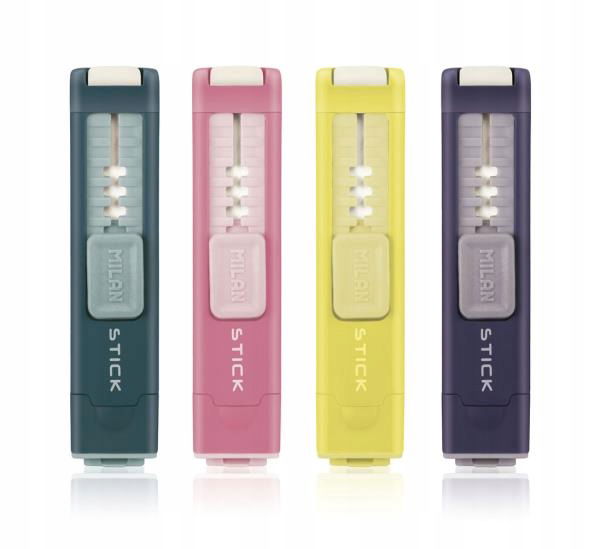 Fantazyjne połączenie temperówki i gumki w jednym. Z jednej strony pojedyncza temperówka na cienkie kredki i ołówki. Z drugiej miękka wysywana długa i prostokątna gumka z syntetycznego kauczuku a pomiędzy pojemnik na ścinki. Mają ostre i wytrzymałe ostrza ze stali węglowej dzięki czemu idealnie nadają się do wszystkich rodzajów ołówków. Posiadają system bezpiecznych ostrzy, który zapobiega odłączeniu się ostrza od korpusu temperówki. Idealne do użytku szkolnego. Dostępne w 4 kolorach: żółtym, fioletowym, różowym i zielonym. Oryginalny produkt stworzony przez własny dział badawczo-rozwojowy MILAN. Rozmiar temperówko-gumki: 8,8 x 1,8 x 1,8 cm.