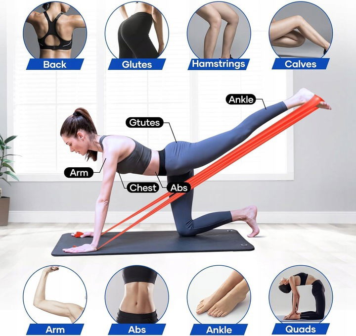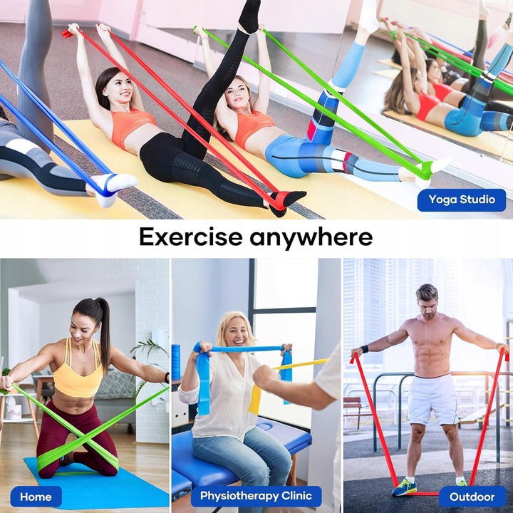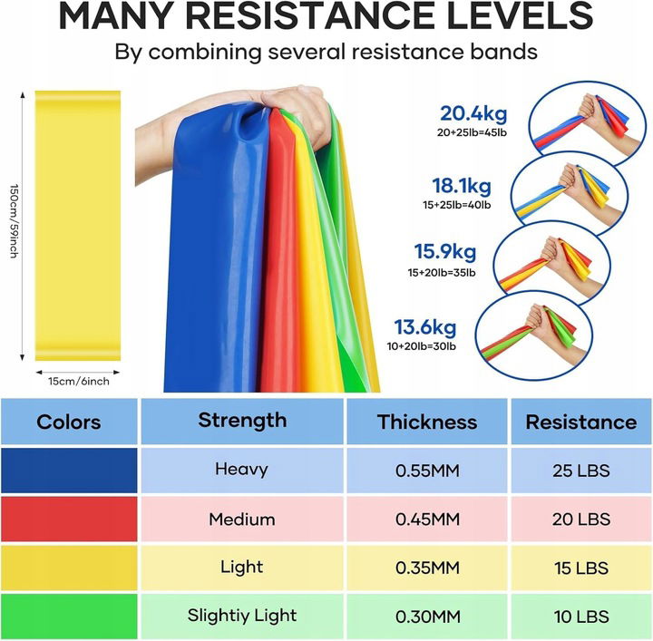 4 poziomy oporu w jednym zestawie W komplecie znajdziesz aż cztery taśmy o różnych grubościach (0,30 mm, 0,35 mm, 0,45 mm, 0,55 mm), co pozwala idealnie dopasować opór do rodzaju ćwiczeń i swojego poziomu zaawansowania. Sprawdzą się zarówno przy rozgrzewce, rozciąganiu, treningu siłowym, jak i w fizjoterapii.