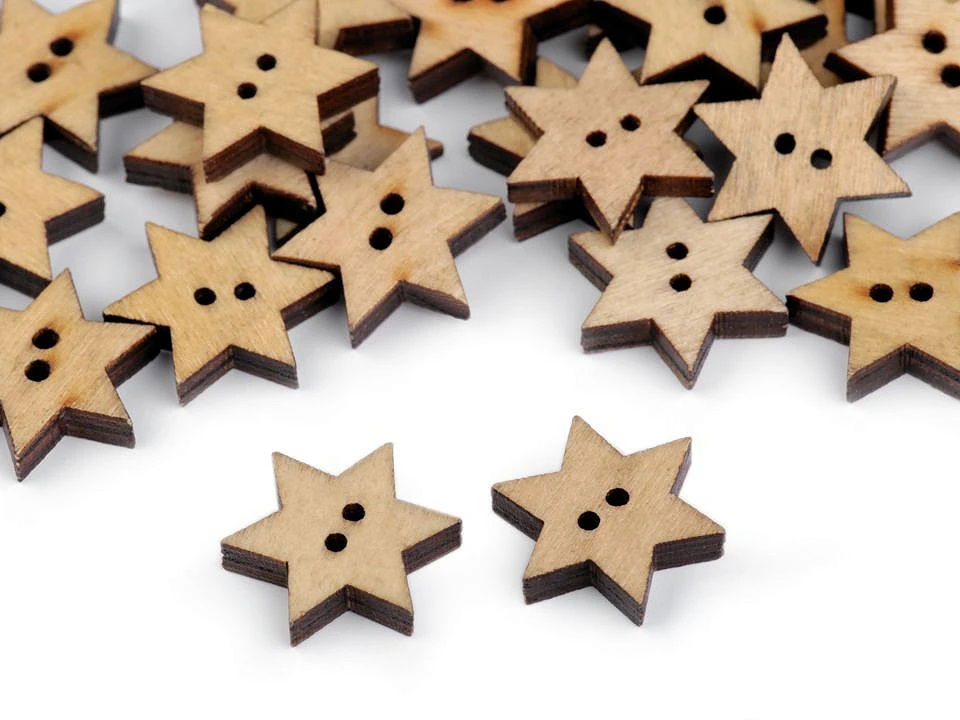 Drewniane guziki w kształcie gwiazdy idealne do techniki scrapbookingu. Można nimi ozdobić ramki, kartki okolicznościowe, winietki, zaproszenia, pamiętniki itp. Można użyć ich do bukietów kwiatowych, które ożywią się dzięki nim. Nie zalecamy ich prać.