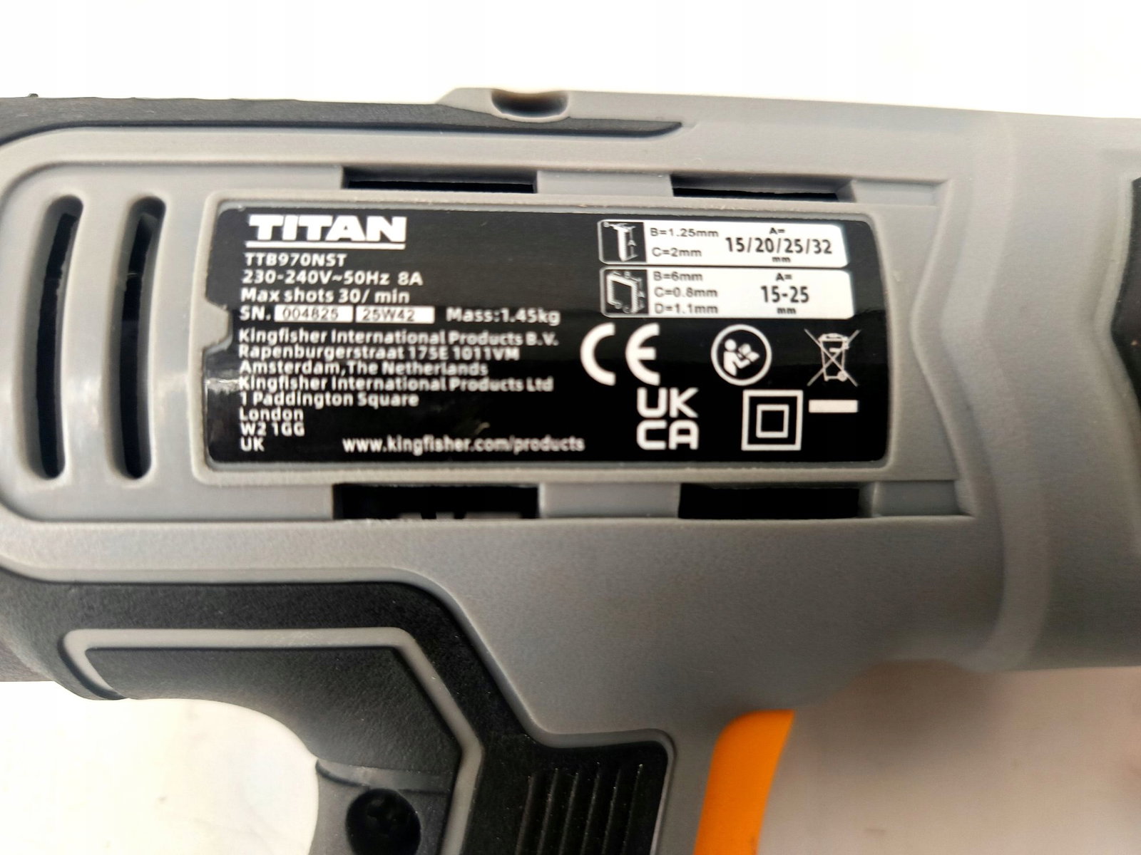 WAŻNA INFORMACJA: AUKCJA DOTYCZY SAMEGO URZĄDZENIA (BEZ DODATKOWYCH AKCESORIÓW, ZSZYWEK CZY GWOŹDZI). NARZĘDZIE POSIADA BRYTYJSKĄ WTYCZKĘ (UK).