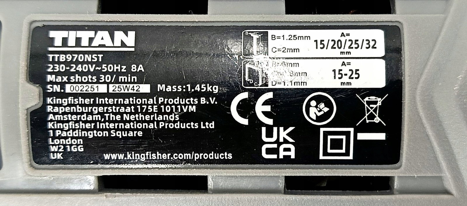 - Gwoździarka / Zszywacz elektryczny Titan TTB970NST (USZKODZONA).