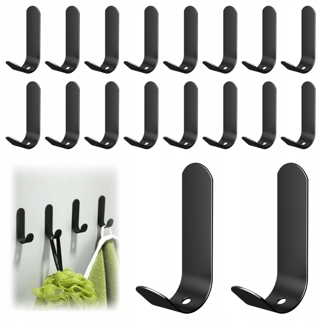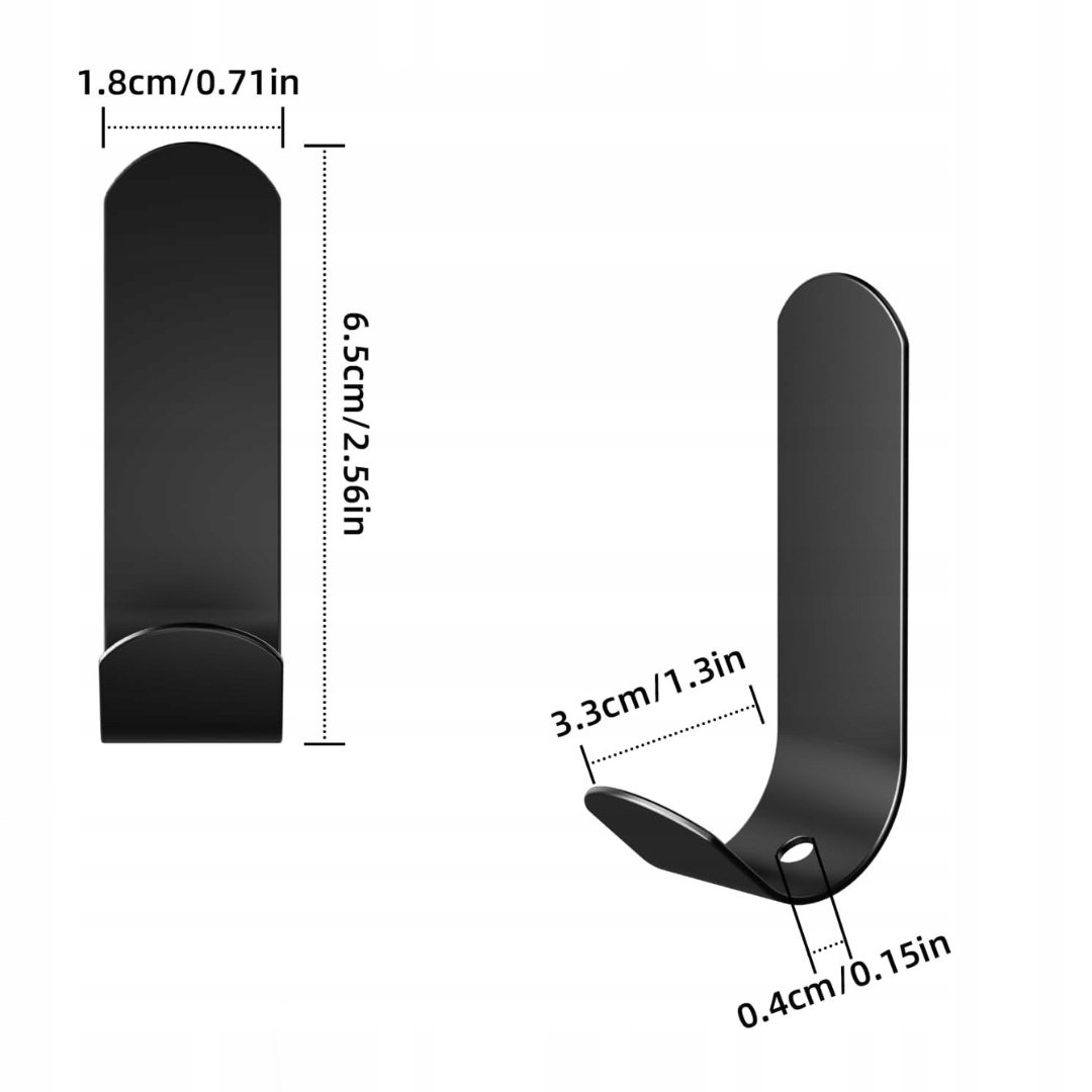 - Oszczędność miejsca: w zestawie znajduje się 18 czarnych haczyków samoprzylepnych o wymiarach 6,5 × 3,3 × 1,8 cm, które pomagają wykorzystać przestrzeń na ścianie lub drzwiach i utrzymać porządek, eliminując bałagan.