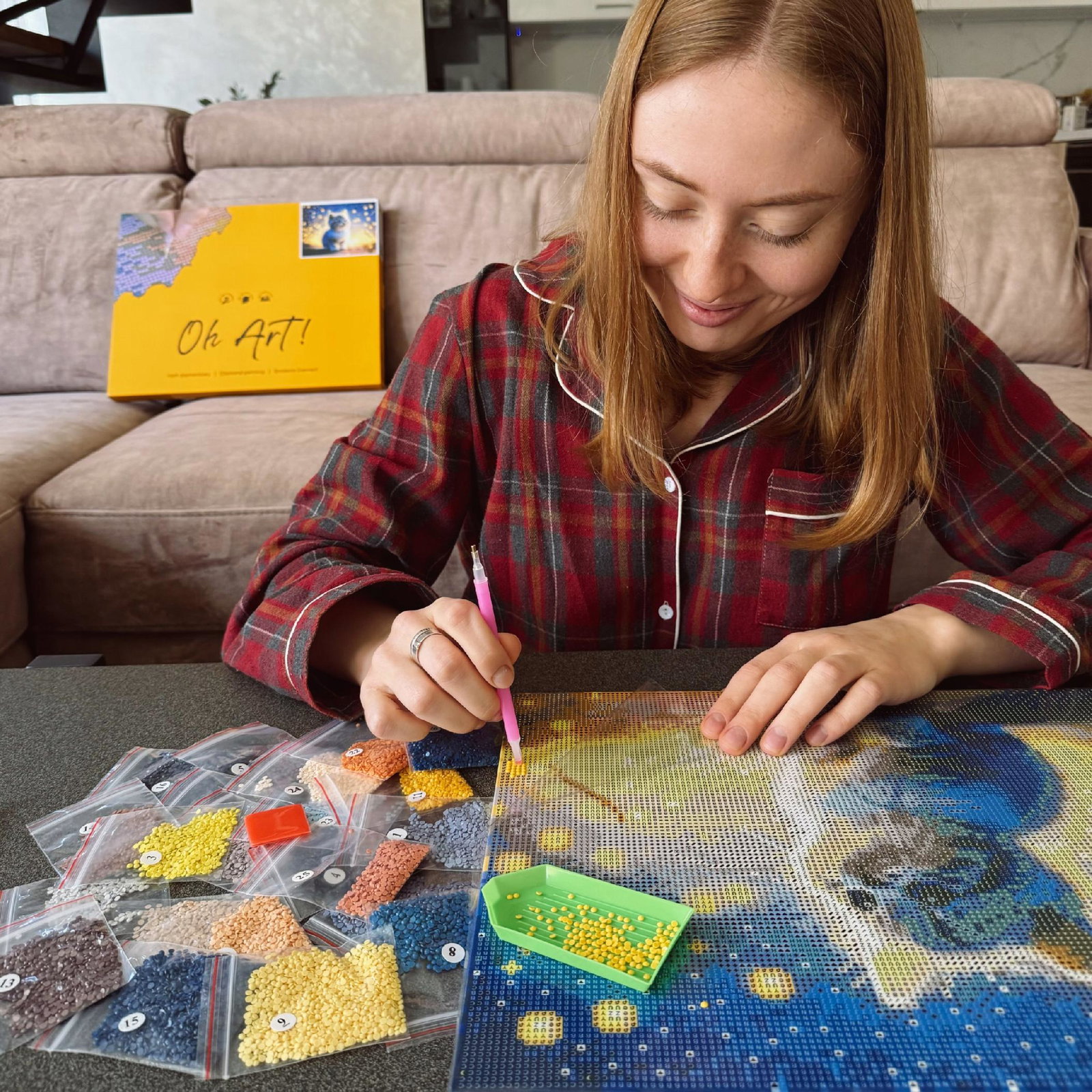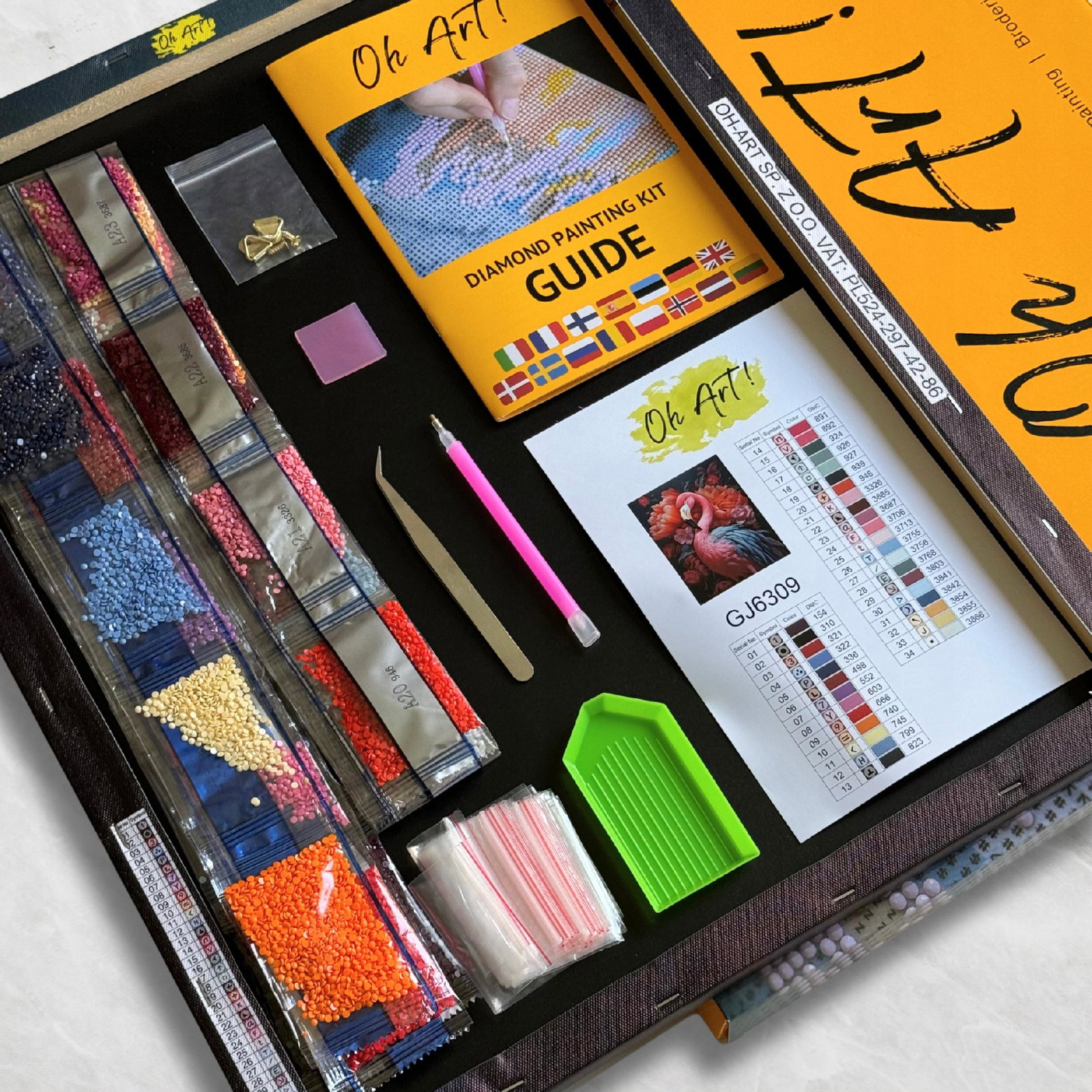 Otwórz opakowanie i sprawdź, czy zawiera wszystkie narzędzia oraz czy kolory kryształków są odpowiednie do obrazu na płótnie.