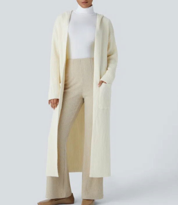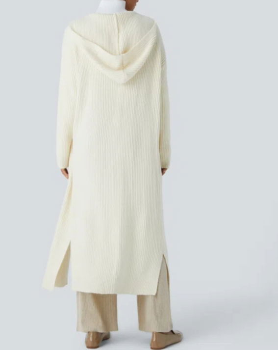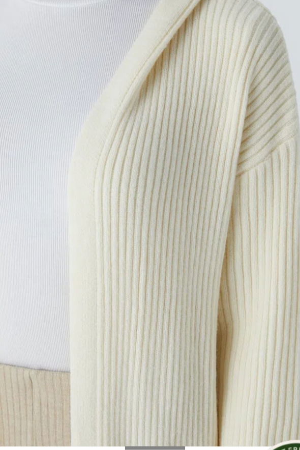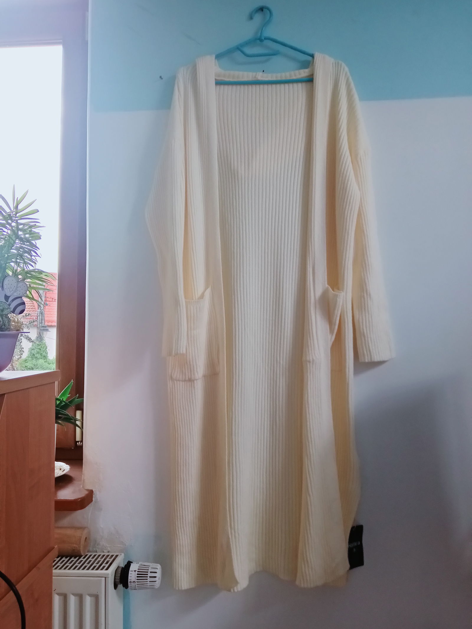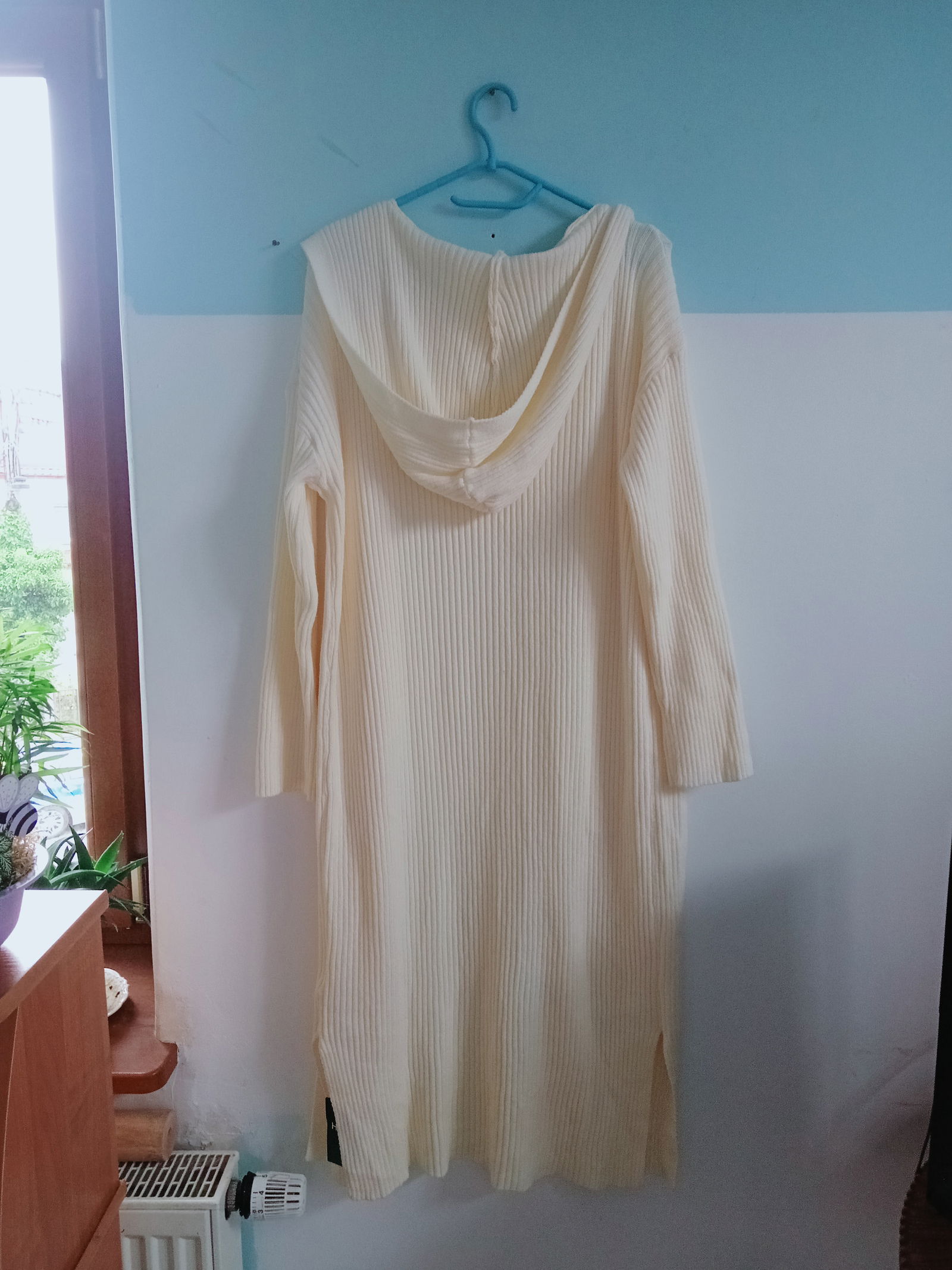 Nowy z metką, prążkowany bardzo długi kardigan w kolorze kremowym,w rozmiarze M. Z dwoma kieszeniami,z kapturem. Bez zapięcia. Rozciągliwy. Biust 122 cm Długość całkowita 116 cm