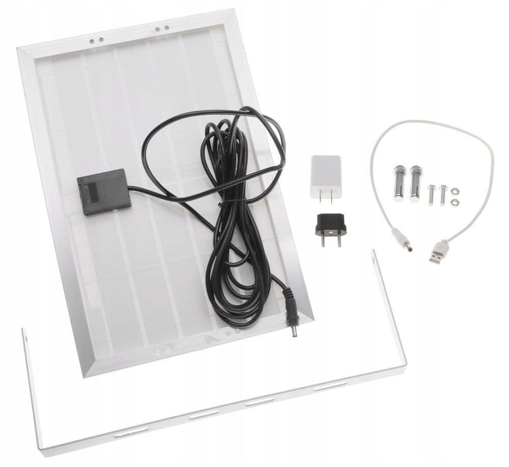• W zestawie: lampa led, panel solarny, elementy montażowe oraz ładowarka sieciowa