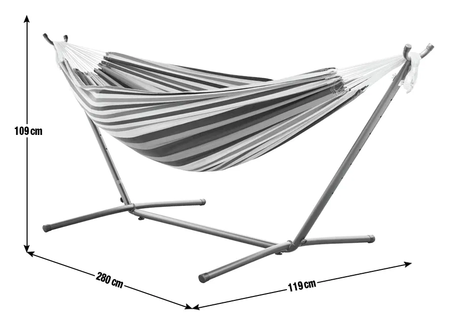 Stojak stalowy malowany proszkowo gwarantuje stabilność i wytrzymałość, a jednocześnie jest odporny na warunki atmosferyczne, dzięki czemu hamak można użytkować przez cały sezon.