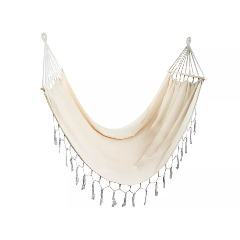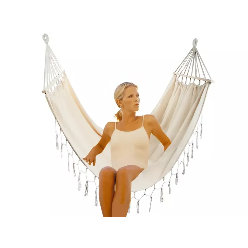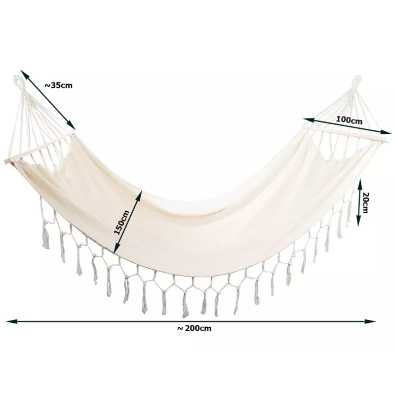 Wykonany jest z wytrzymałego materiału, podobnie jak grubo plecione sznury. Wszystko to sprawia, że hamak jest wytrzymały oraz przepuszcza powietrze, dzięki czemu używanie go będzie bardzo przyjemne. Został wzmocniony dwoma drewnianymi poprzeczkami, dzięki czemu jest stabilny oraz ułatwia wchodzenie i wychodzenie z hamaka.