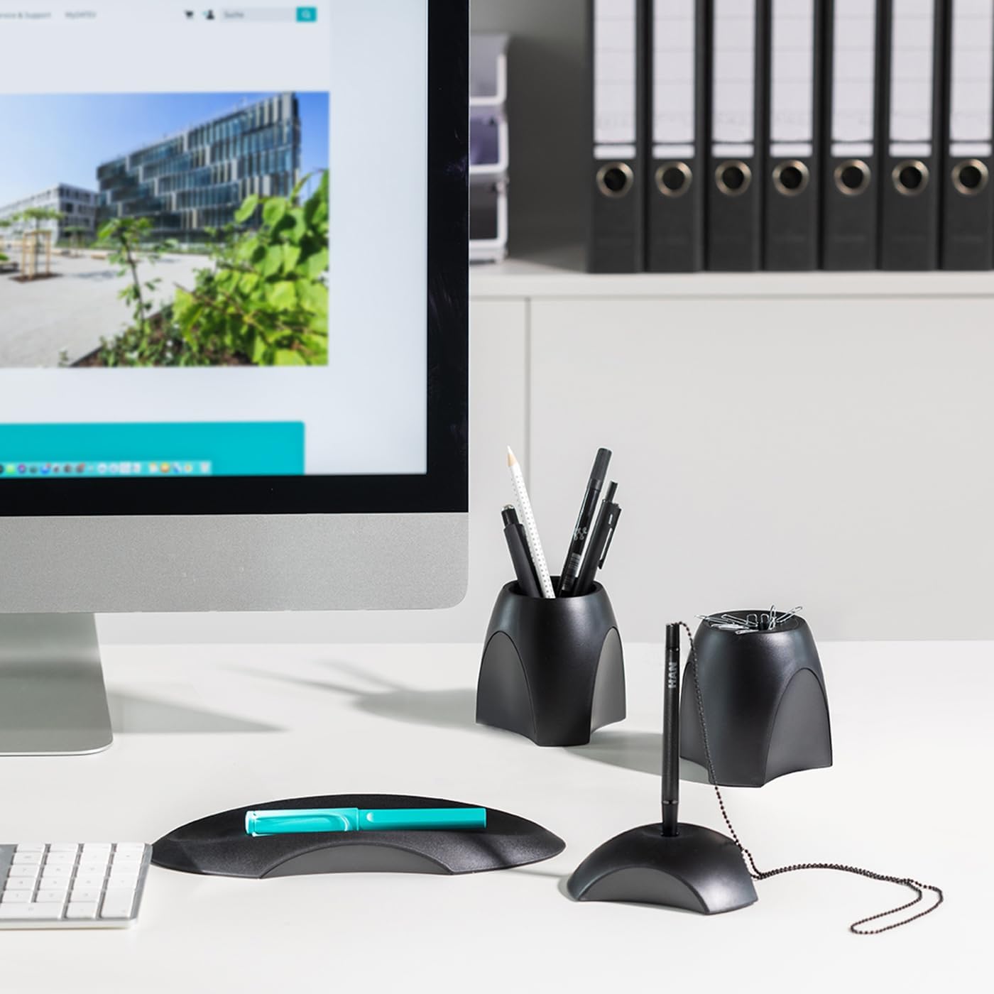 Uchwyt na długopisy zapewnia optymalną organizację biurka: półka na długopisy pomieści do 3 długopisów, otwieracz do listów, a nawet mniejsze przybory biurowe