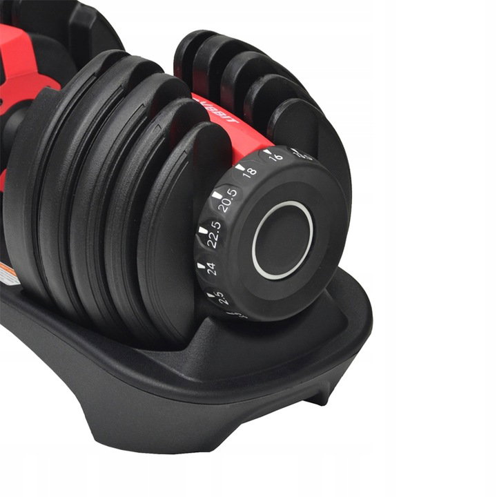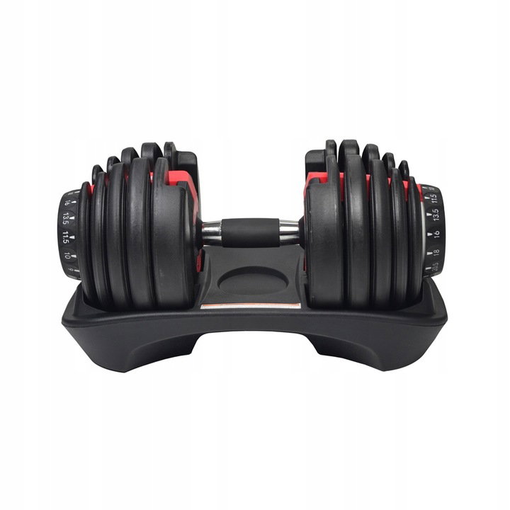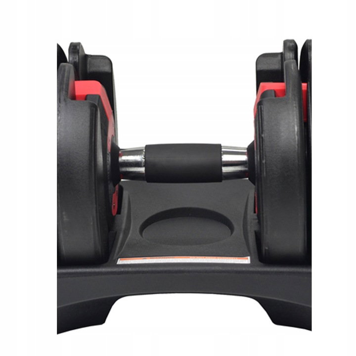 Jeśli chcesz wyregulować obciążanie, wystarczy, że odłożysz hantel na podstawkę. Następnie przekręć oba pokrętła na docelową wagę, jakiej potrzebujesz. Na koniec unieś sprzęt i ciesz się z udanych ćwiczeń siłowych. W ten sposób nie musisz każdorazowo zdejmować zacisków i zmieniać talerzy w celu dobrania optymalnego ciężaru.