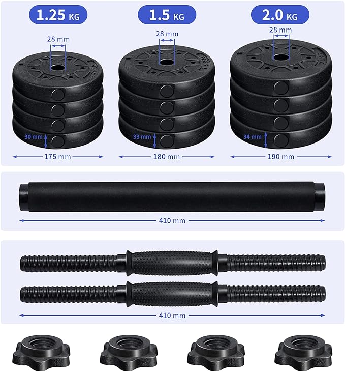 PREMIUM & TRWAŁY: Zestaw hantli Wemk składa się z wytłoczonych / matowych płyt ciężarowych z widocznymi śladami ciężarów. Wypełnienie betonowe i warstwa czarnej farby na powierzchni zapobiegają rdzewieniu i korozji. Pusta stal do pręta łączącego o grubości do 3 mm zapewnia niezawodną i trwałą wytrzymałość. Odporny na rdzę i zużycie.