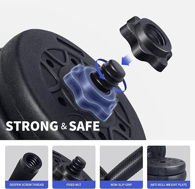 BEZPIECZNE I ANTYCHNE PROJEKTOWANIE : zestaw hantli jest wyposażony w antypoślizgowy uchwyt, który pozwala na stworzenie wygodnego chwytu i znacznie poprawia tarcie, zapewniając pewny, bezpieczniejszy i wygodniejszy chwyt. 4 gwiazdkowe zamki bezpieczeństwa zapobiegają toczeniu się i przymocowanie ciężarów do hantli. Antypoślizgowe podkładki boczne zapobiegają toczeniu się hantli.