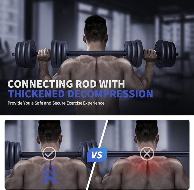 Chroń swoje ciało: Pręt łączący jest pokryty piankową powłoką, która może chronić szyję, ramiona i dłonie przed drążkiem do podnoszenia ciężarów oraz zapewnia wygodny trening. Gumowy drążek do hantli dopasowuje się do dłoni i może bezpiecznie i skutecznie wzmocnić siłę centralną.