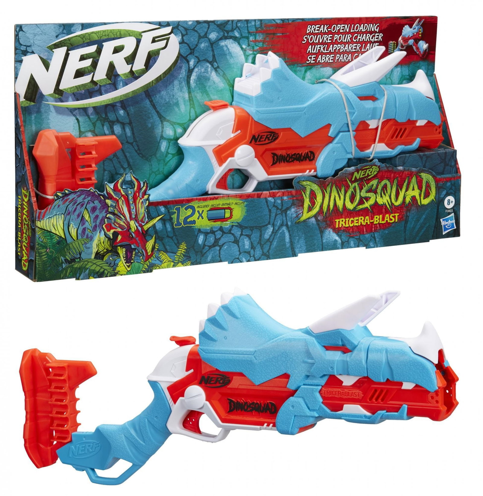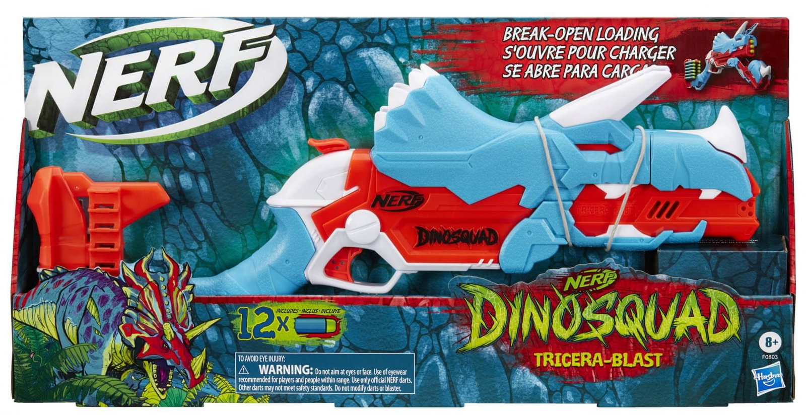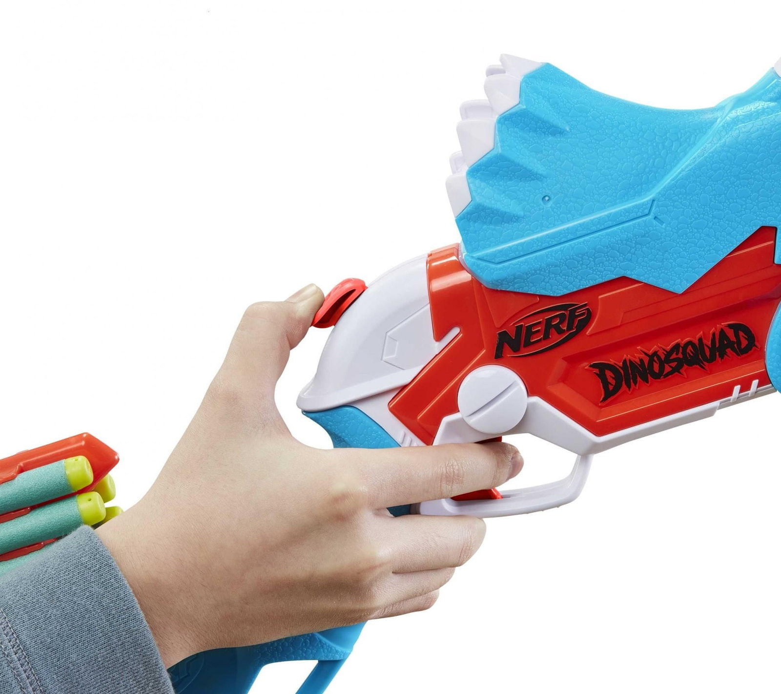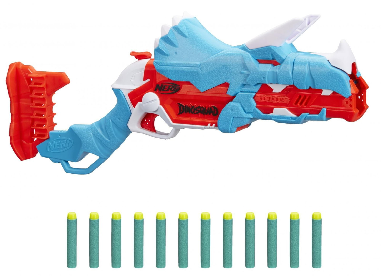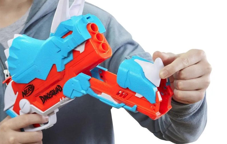 Wkrocz do akcji z trzema strzałkami z blasterem Nerf DinoSquad Tricera! Ma niesamowity wzór dinozaura, który oddaje wygląd dinozaura Triceratopsa. Blaster ma ładowanie otwierane i które można zabawnie otworzyć - naciśnij przedni klakson na głowie dinozaura, a lufa opadnie, by odsłonić komorę na strzałki w środku. Załaduj 3 rzutki i zamknij lufę. Pociągnij w dół młotek, aby napełnić blaster, a następnie naciśnij spust, aby wystrzelić 1 strzałkę w kierunku celu. W magazynie znajduje się wbudowana pamięć na 12 rzutek, dzięki czemu możesz mieć zapasowe rzutki w zasięgu ręki, aby przeładować i kontynuować grę. Zawiera 12 oficjalnych rzutek z pianki Nerf Elite, które zostały przetestowane i zatwierdzone pod kątem wydajności i jakości.
