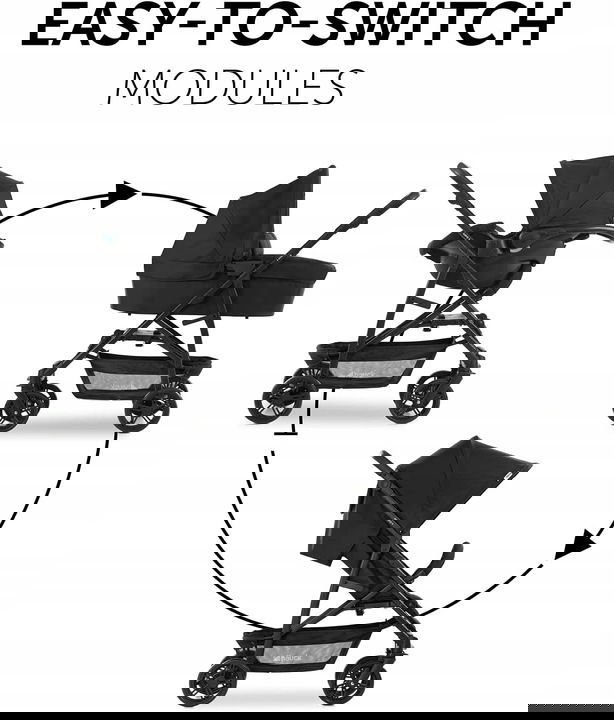 3 w1 – spójny z przestronnym wózkiem dziecięcym z materacem (do 9 kg), fotelik samochodowy 0+ z wkładką do siedzenia i ochroną przed uderzeniami bocznymi (do 13 kg), siedzisko wózka dziecięcego (do 22 kg) + kosz na zakupy (3 kg)