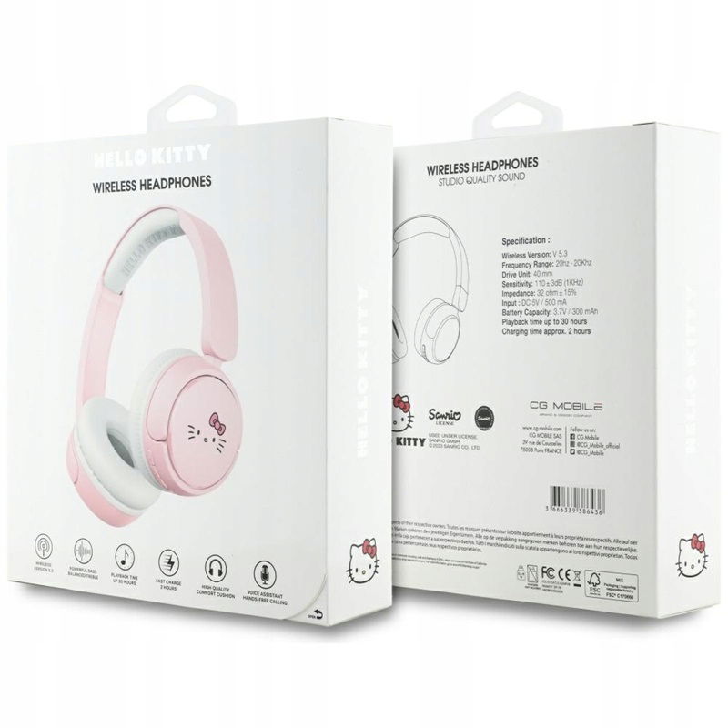 Bezprzewodowe słuchawki nauszne Hello Kitty Face Logo, które łączą niezrównane doznania dźwiękowe z niepowtarzalnym stylem marki Hello Kitty. Odkryj nowy wymiar muzyki dzięki zaawansowanej technologii, zamkniętej w wyrafinowanym designie, który zawsze przyciąga spojrzenia.