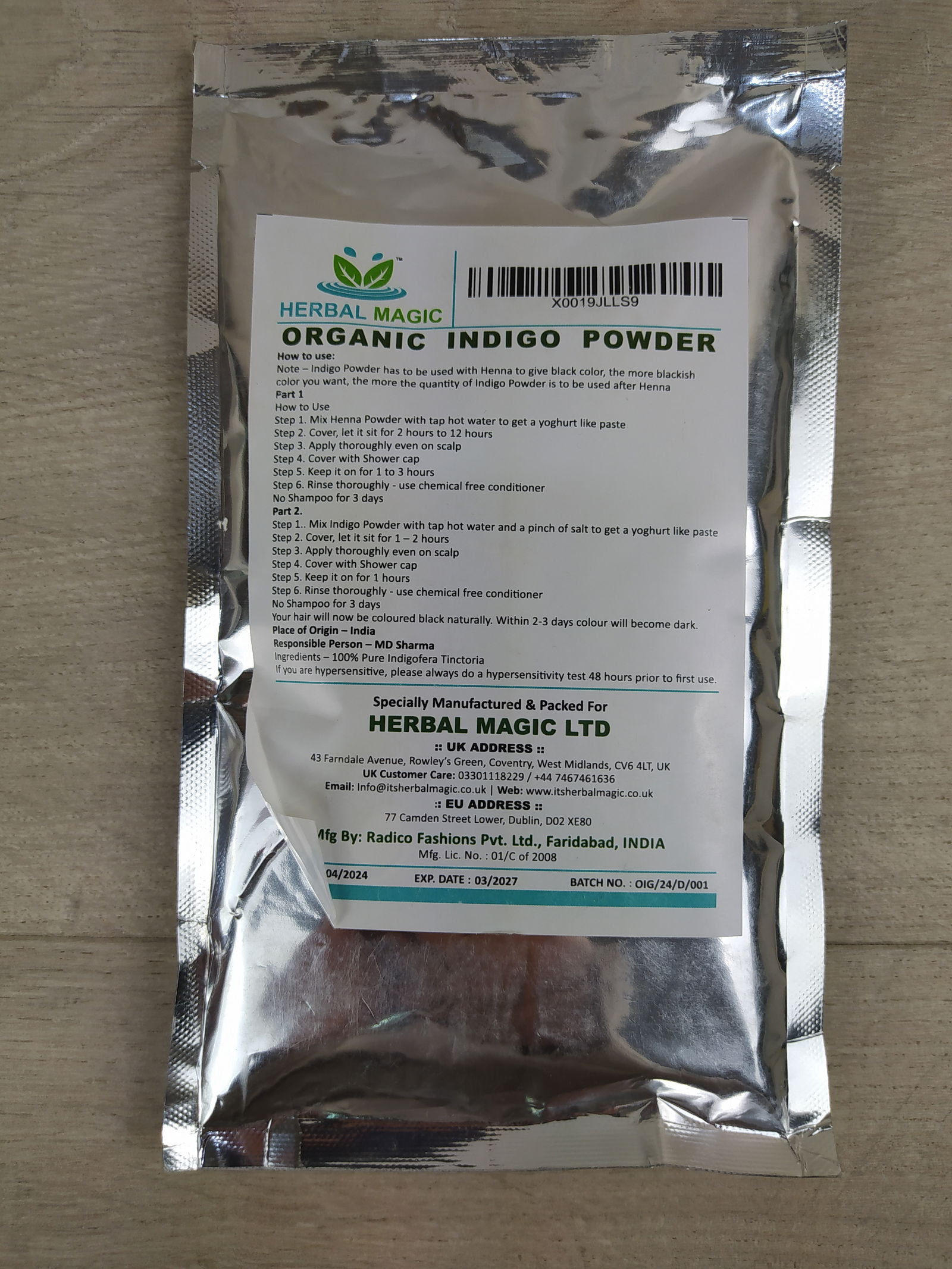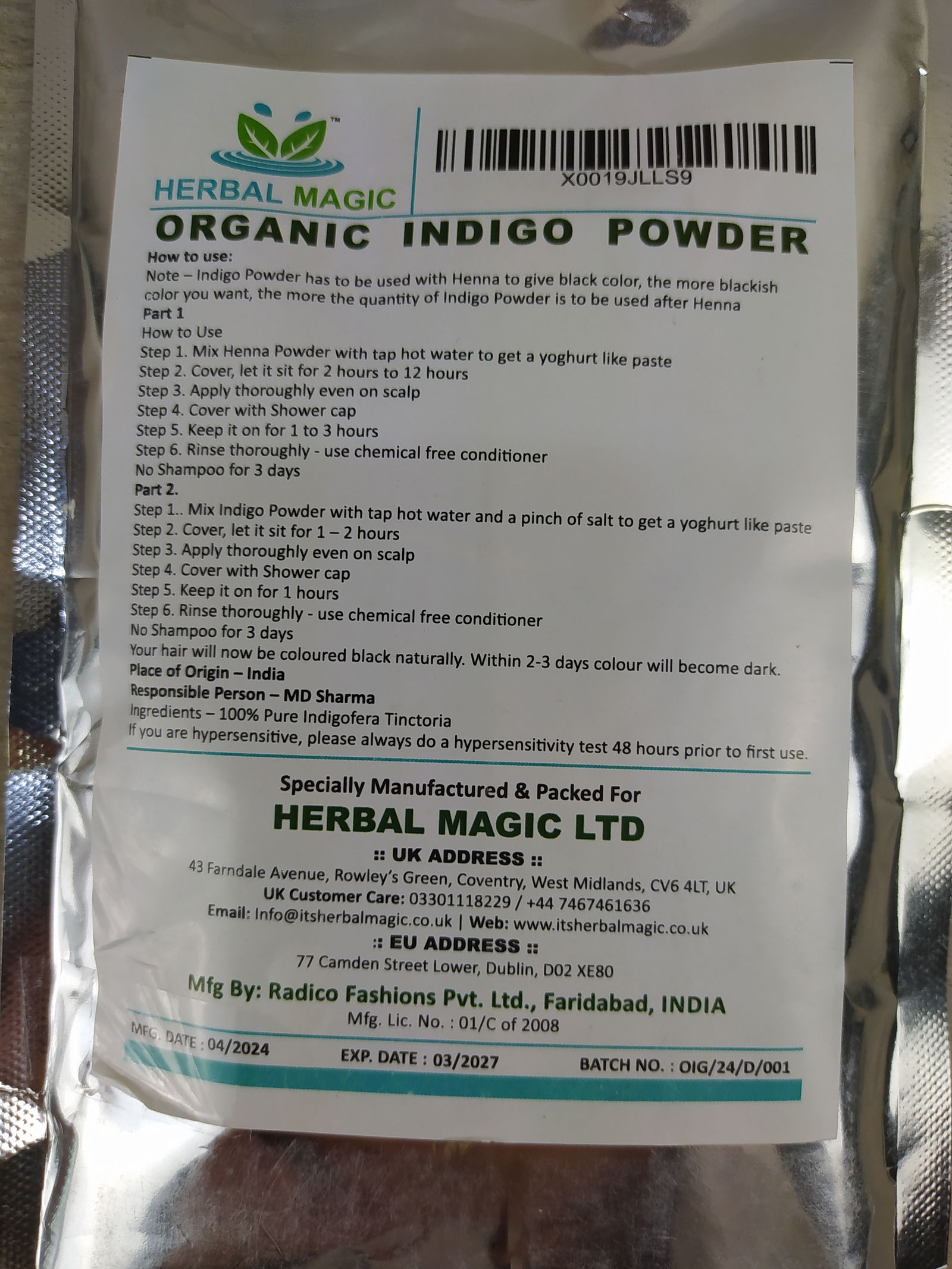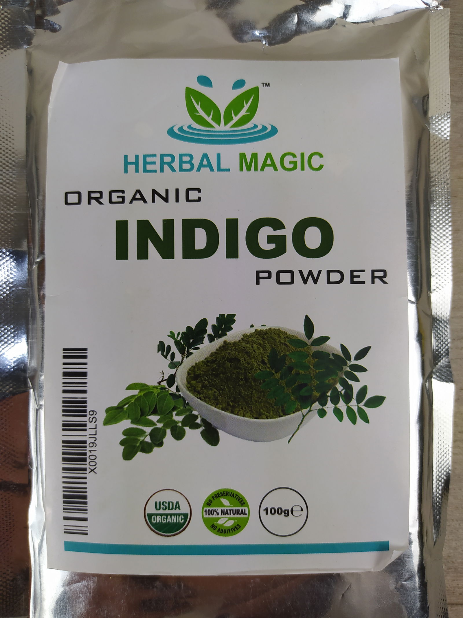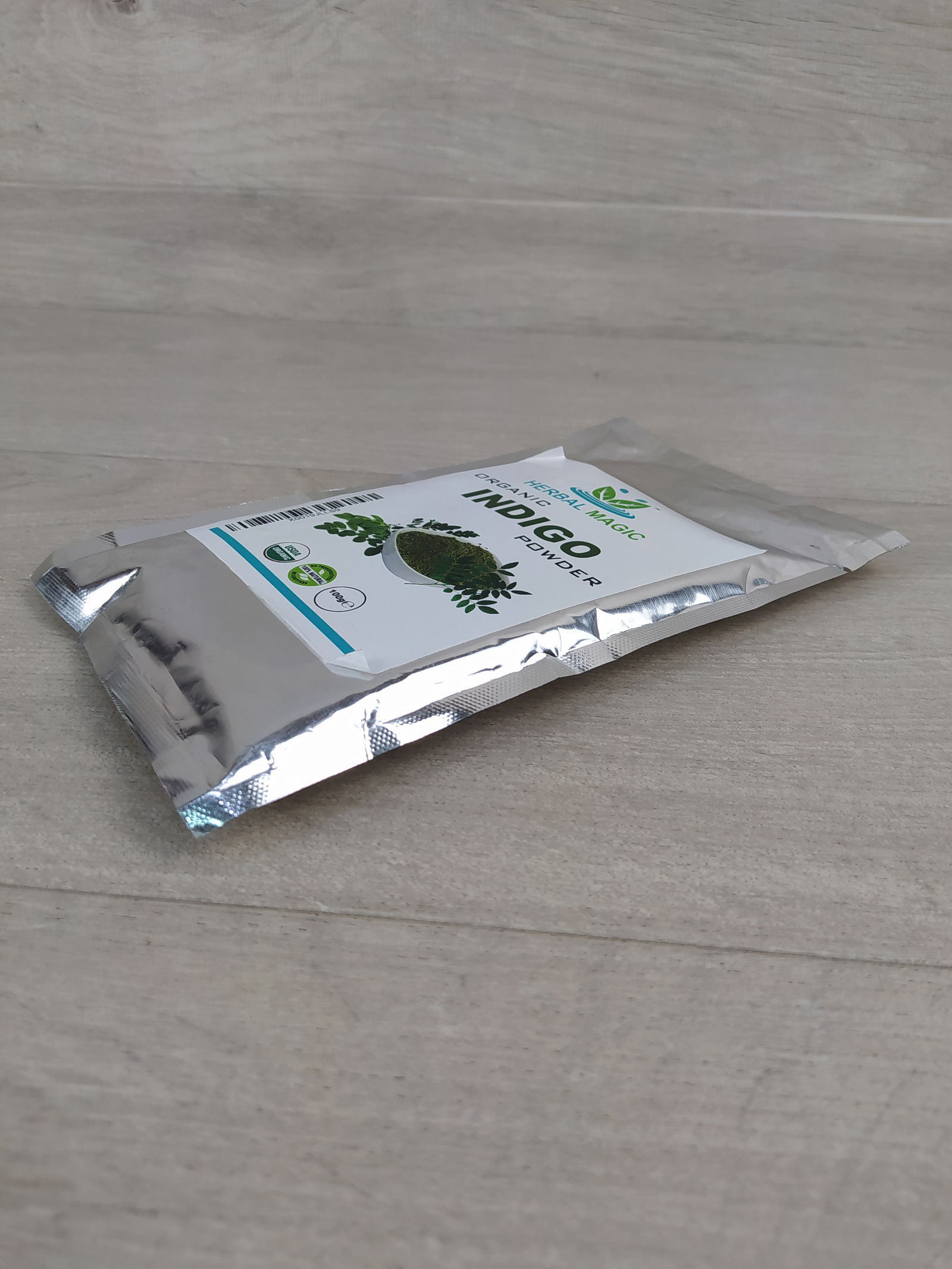 Indigo Herbal Magic to w pełni naturalny proszek do koloryzacji włosów, który nadaje im głęboki odcień czerni lub ciemnego brązu. Produkt powstał wyłącznie z roślinnych składników – bez chemicznych dodatków, konserwantów czy sztucznych barwników.