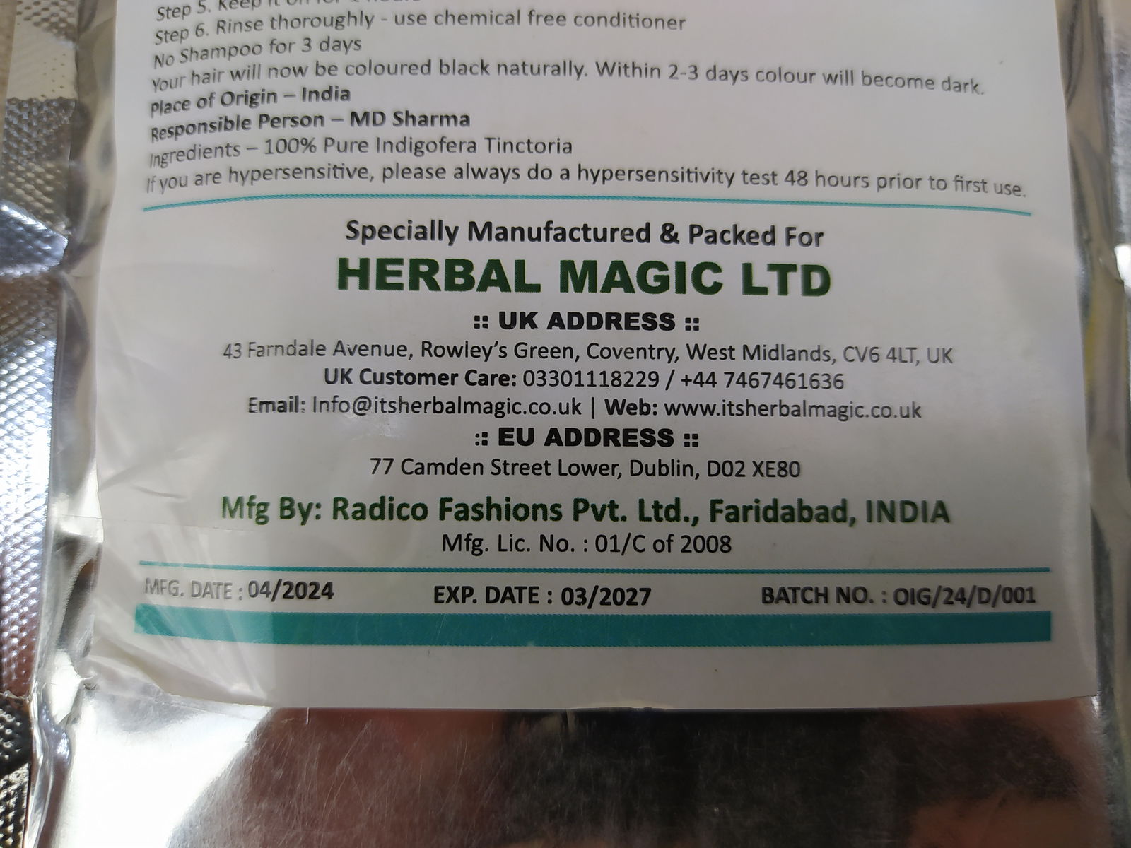 Sposób użycia: Proszek należy wymieszać z ciepłą wodą do uzyskania gęstej pasty, nałożyć na wilgotne włosy, pozostawić na 1–2 godziny, a następnie dokładnie spłukać.