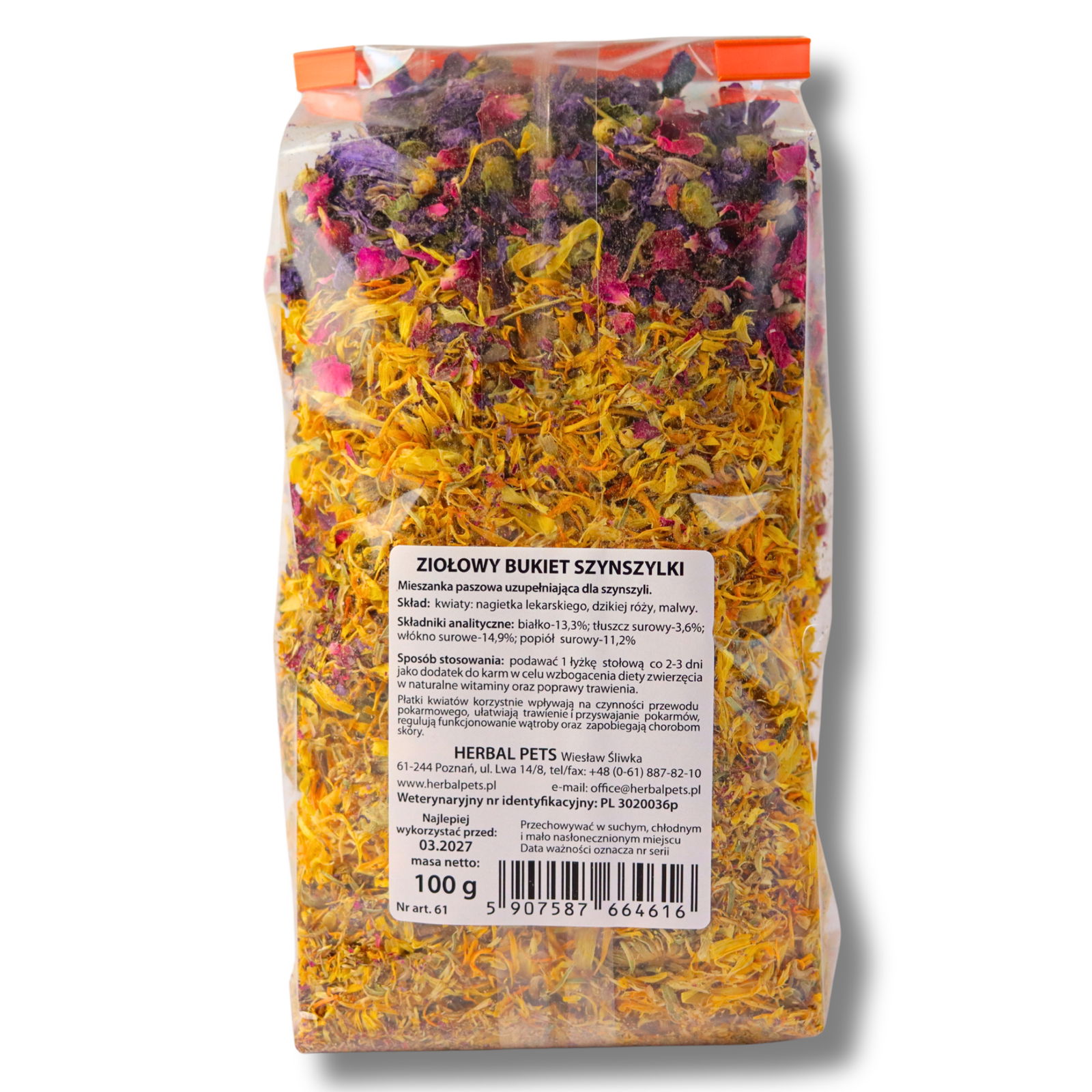 Ziołowy bukiet dla szynszyli Herbal Pets to naturalny, kwiatowy dodatek do diety, który urozmaica codzienne żywienie i jest bardzo chętnie pobierany przez zwierzęta. Mieszanka suszonych kwiatów stanowi nie tylko atrakcyjny wizualnie, ale również wartościowy element diety szynszyli.