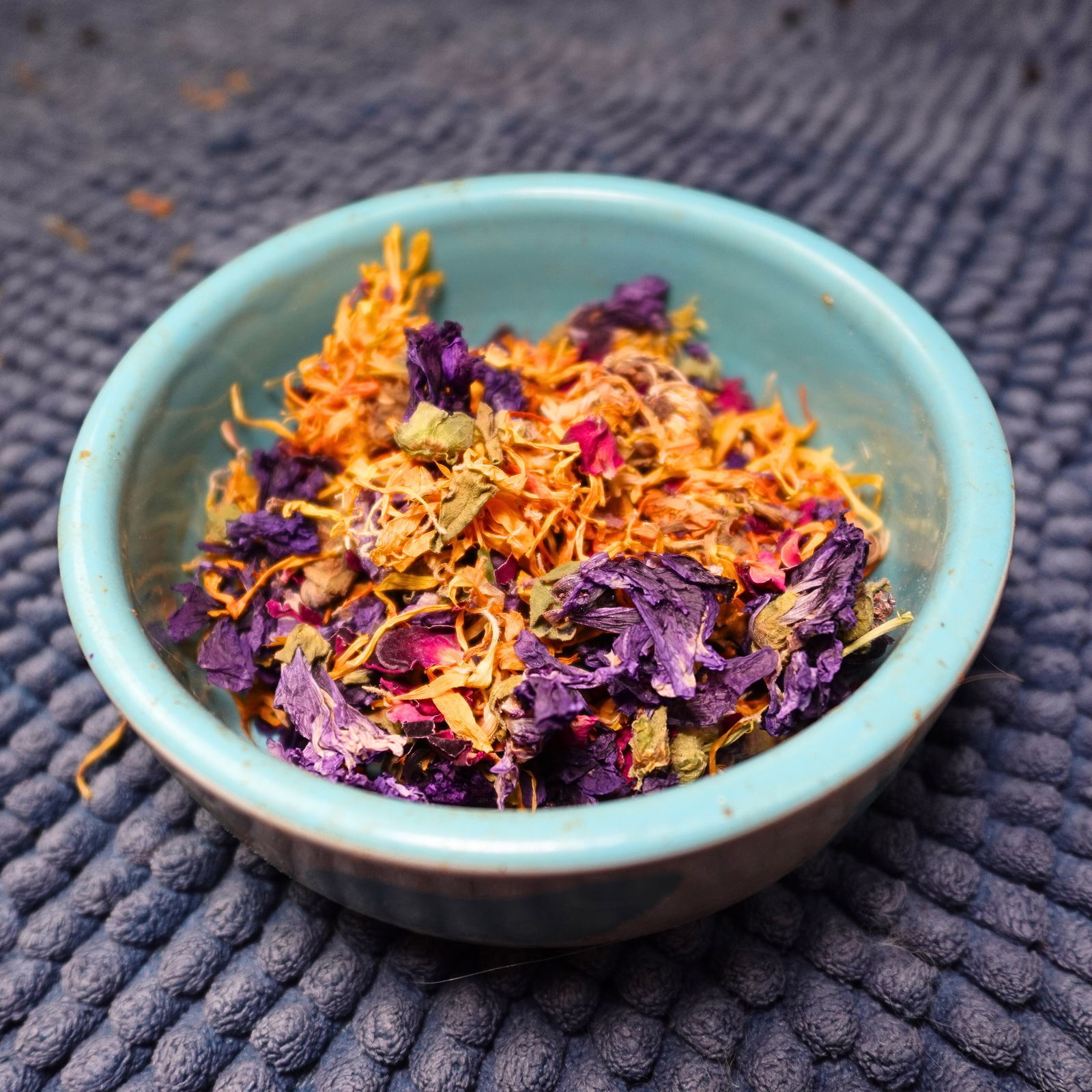 Skład: kwiaty nagietka lekarskiego, dzikiej róży, malwy. Składniki analityczne: białko surowe 13,3 %, tłuszcz surowy 3,6 %, włókno surowe 14,9 %, popiół surowy 11,2 %.
