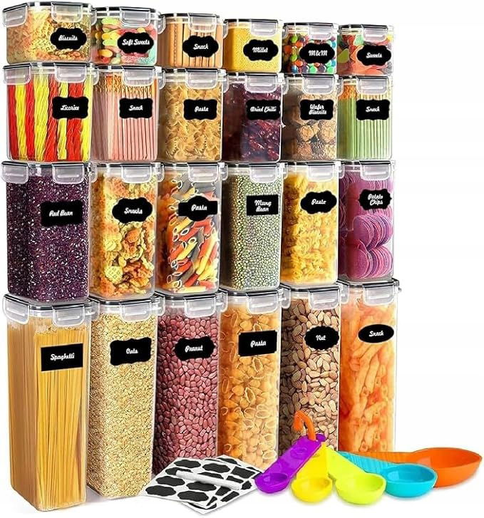 ✅Zorganizuj swoją kuchnię jak profesjonalista dzięki temu gigantycznemu zestawowi 24 hermetycznych pojemników! ? ✨ To idealne rozwiązanie dla każdego, kto chce utrzymać świeżość produktów sypkich, takich jak płatki śniadaniowe, mąka, cukier, a nawet karma dla zwierząt. Dzięki przezroczystym ściankom oraz dołączonym etykietom, zawsze będziesz wiedzieć, co znajduje się w środku, a Twój blat lub spiżarnia zyskają nowoczesny i uporządkowany wygląd! ? ?