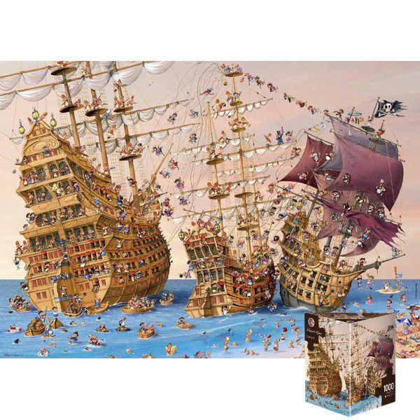 Puzzle HEYE „Piraci” to wyjątkowy zestaw 1000 elementów z ilustracją autorstwa François Ruyera, znanego z pełnych detali i humoru grafik. Po ułożeniu powstaje obraz o wymiarach 70 × 50 cm, przedstawiający piracki statek w fantazyjnej scenerii. Idealne dla miłośników kreatywnych wyzwań i artystycznych motywów.