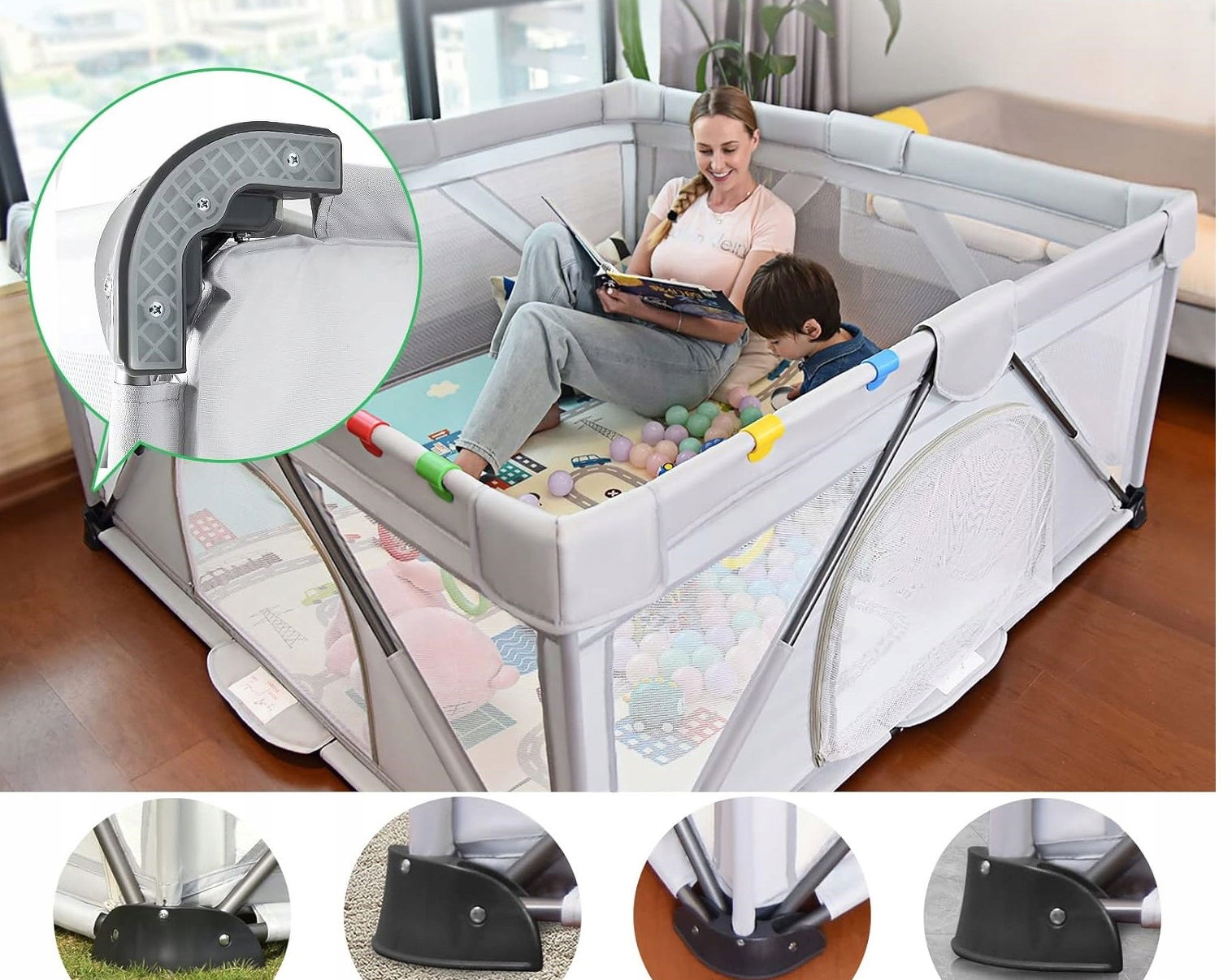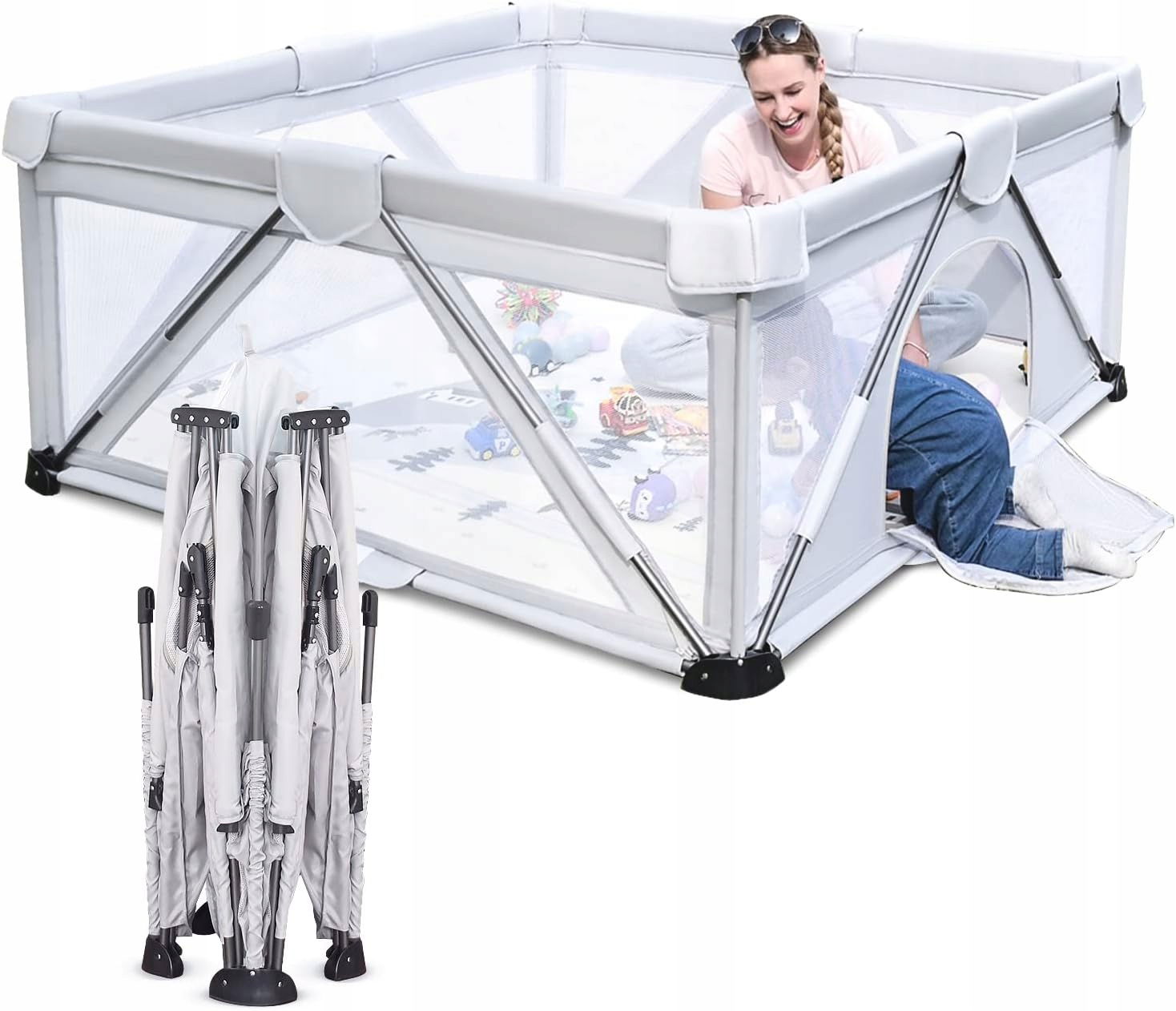 Ten duży plac zabaw o wymiarach 160 cm (dł.)×120 cm (szer.)×68 cm (wys.) oferuje 1,92 metra kwadratowego bezpiecznej przestrzeni do zabawy. Posiada dwie bramki, które mogą być otwierane tylko z zewnątrz przez rodziców, co zapewnia bezpieczne wejście i wyjście dla dzieci. Dzięki temu więcej dzieci i ich rodzice mogą cieszyć się wspólnym dorastaniem w bezpiecznej i kontrolowanej przestrzeni. Kojec jest wykonany z wytrzymałej tkaniny w kolorze zimny szary.