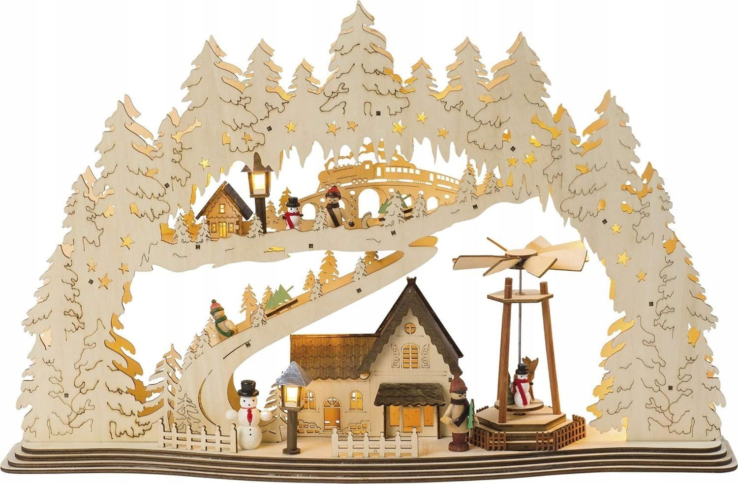 Łuk świetlny przedstawia piękny motyw adwentowy na dwóch poziomach z bałwanami i latarniami
