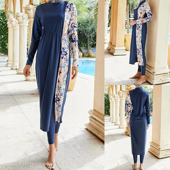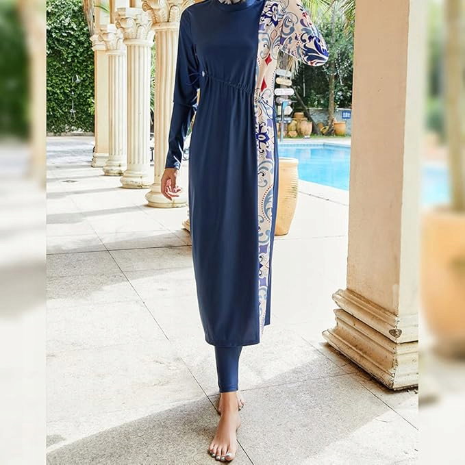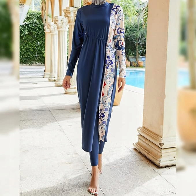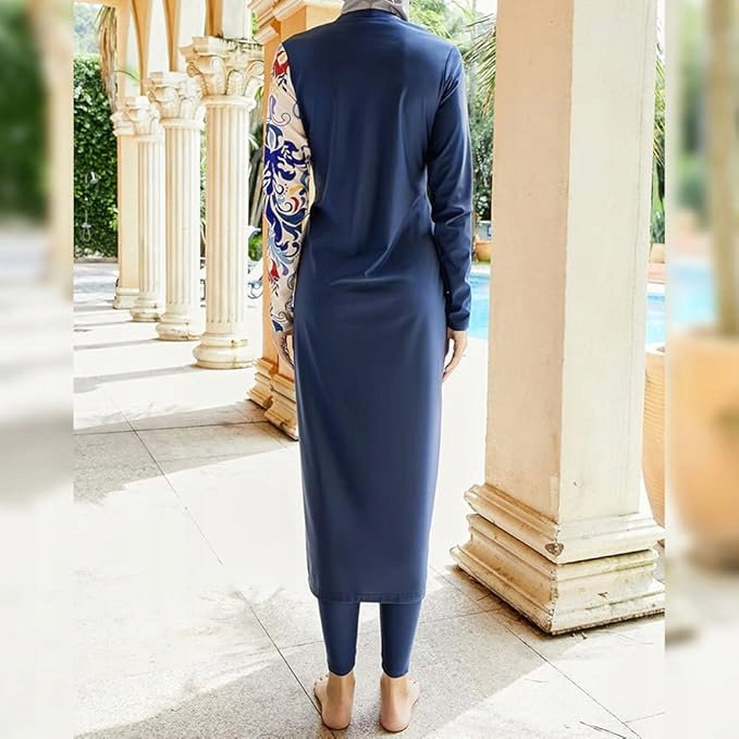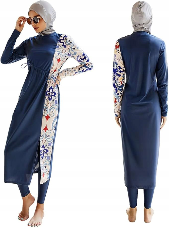 ⭐ Ten model Burkini składa się z kilku elementów: bluzki z długim rękawem, dopasowanych legginsów oraz wbudowanego hidżabu, który zapewnia pełne zakrycie głowy i szyi.