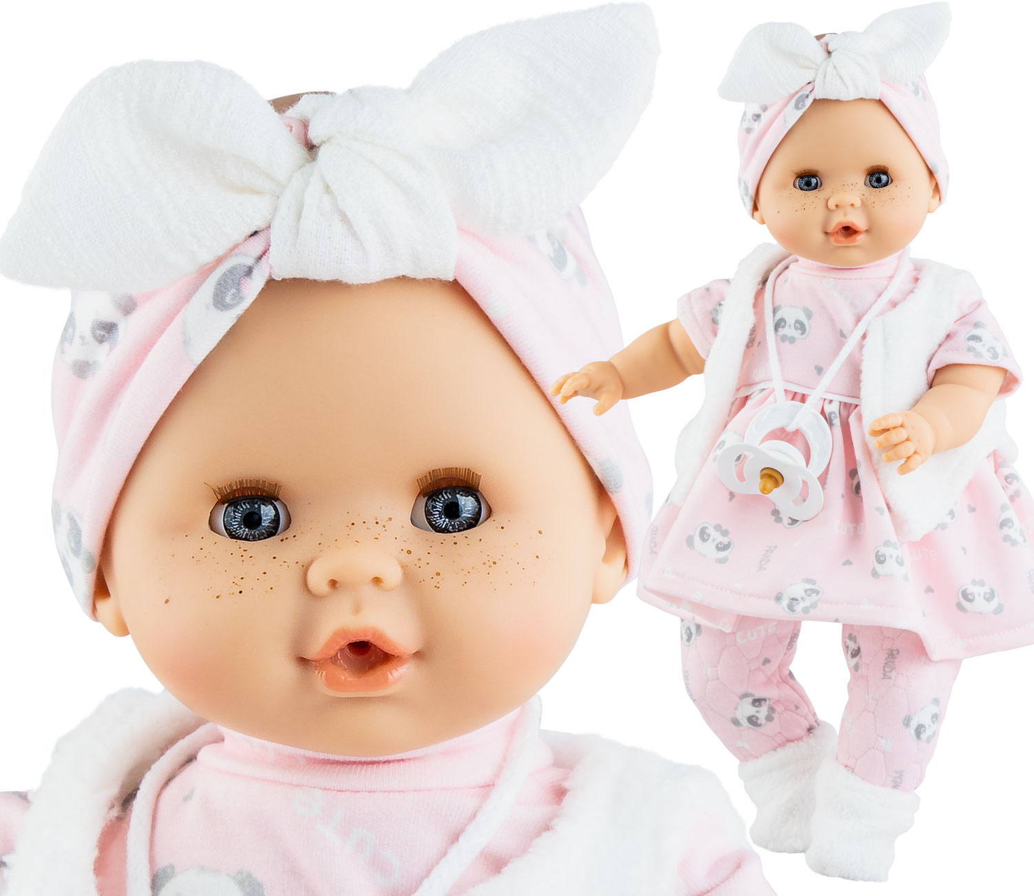Firma Paola Reina tworzy wyjątkowe i niepowtarzalne lalki, których marką stały się piękno i najwyższa jakość wykonania!Lalki firmy Paola Reina to gwarancja doskonałej jakości wykonania. Wytwarzane są ręcznie 100% w Hiszpanii. Są produktami markowymi, spełniającymi restrykcyjne normy dotyczące bezpieczeństwa zabawek CE.Sonia 08037Sonia o numerze katalogowym 08037 jest laleczką wykonaną z najlepszego, pachnącego karmelem, winylu.Laleczka została pięknie i starannie wykonana - ma idealnie zachowane proporcje, śliczne zamykane oczy z rzęsami.Laleczka posiada mechanizm dźwiękowy, dzięki któremu płacze oraz mówi mama, papa. Po włożeniu smoczka do ust laleczka uspokaja się.Ciało jest miękkie, materiałowe.Ze szczególną dbałością zostało również uszyte ubranko, które zachwyca fasonem i kolorami.Wielkość laleczki: 36 cmLaleczka Sonia o numerze 08037 posiada:- sukienkę,- spodenki,- bezrękawnik,- opaskę,- skarpetki,- smoczek.Laleczka zapakowana jest w gustowne i eleganckie pudełko.