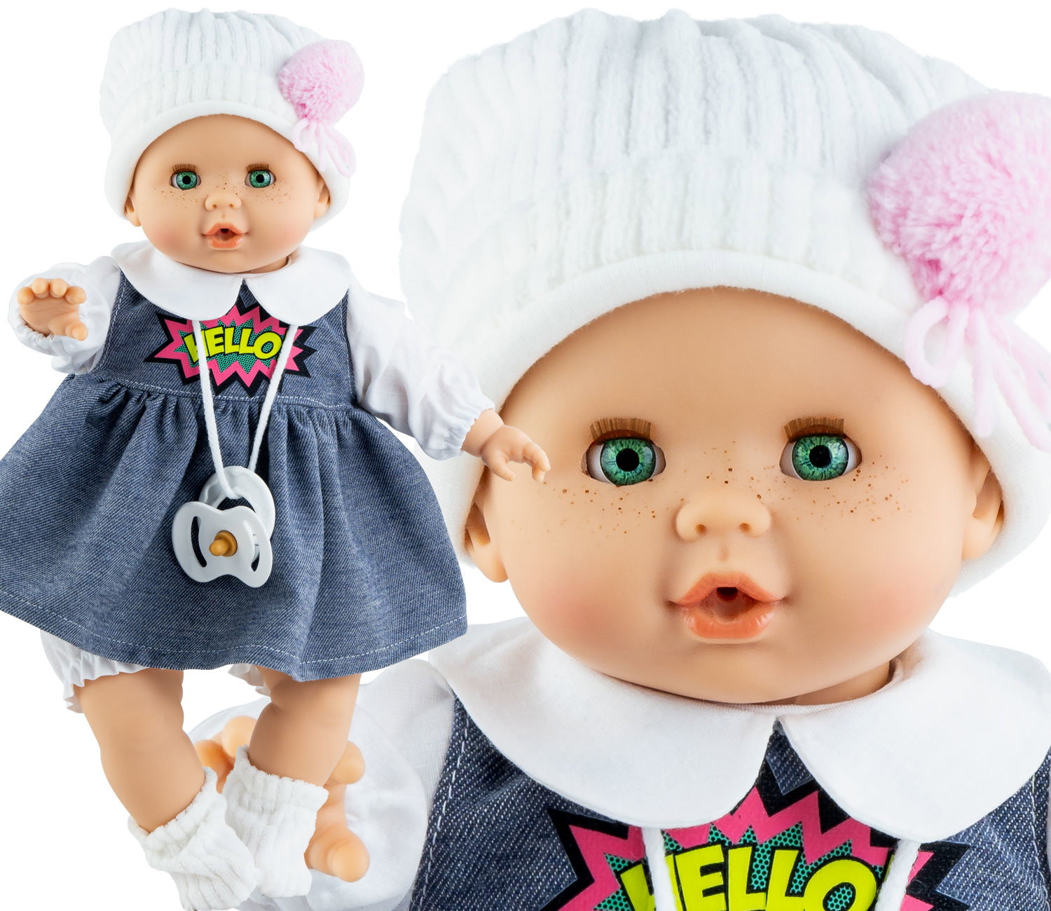 Firma Paola Reina tworzy wyjątkowe i niepowtarzalne lalki, których marką stały się piękno i najwyższa jakość wykonania!Lalki firmy Paola Reina to gwarancja doskonałej jakości wykonania. Wytwarzane są ręcznie 100% w Hiszpanii. Są produktami markowymi, spełniającymi restrykcyjne normy dotyczące bezpieczeństwa zabawek CE.Sonia 08038Sonia o numerze katalogowym 08038 jest laleczką wykonaną z najlepszego, pachnącego karmelem, winylu.Laleczka została pięknie i starannie wykonana - ma idealnie zachowane proporcje, śliczne zamykane oczy z rzęsami.Laleczka posiada mechanizm dźwiękowy, dzięki któremu płacze oraz mówi mama, papa. Po włożeniu smoczka do ust laleczka uspokaja się.Ciało jest miękkie, materiałowe.Ze szczególną dbałością zostało również uszyte ubranko, które zachwyca fasonem i kolorami.Wielkość laleczki: 36 cmLaleczka Sonia o numerze 08038 posiada:- sukienkę,- spodenki,- czapeczkę,- skarpetki,- smoczek.Laleczka zapakowana jest w gustowne i eleganckie pudełko.