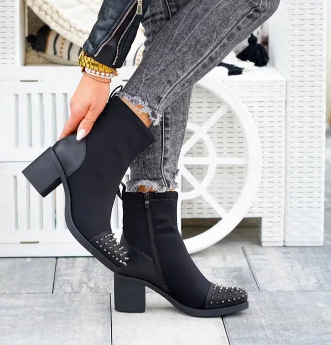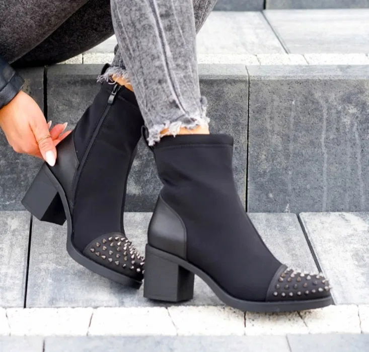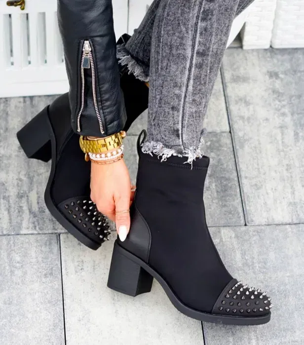 Śliczne jesienne botki z ozdobnymi kolcami w kolorze czarnym. Wykonane z wysokiej jakości pianki (przypomina satynkę) i skórki eko. Wewnątrz pianka termiczna z meszkiem. Nietuzinkowe botki to absolutny must-have na przejściowe pory roku.