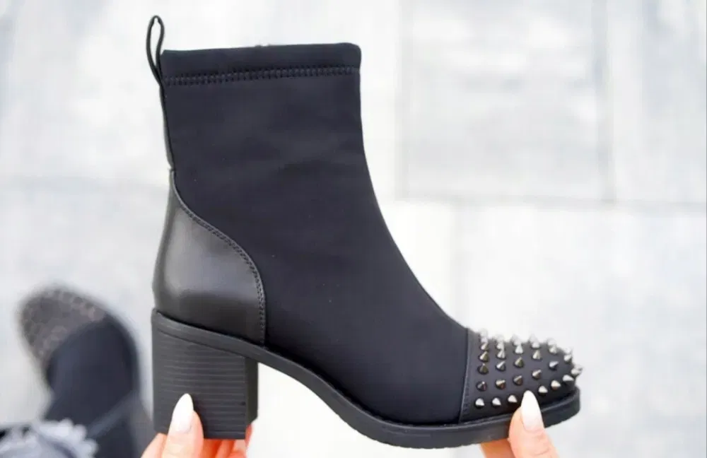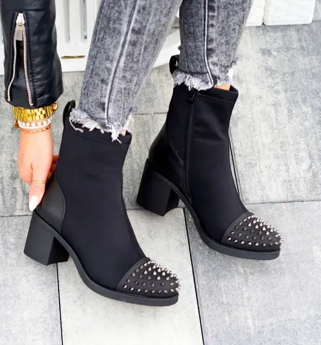 Śliczne jesienne botki z ozdobnymi kolcami w kolorze czarnym. Wykonane z wysokiej jakości pianki (przypomina satynkę) i skórki eko. Wewnątrz pianka termiczna z meszkiem. Nietuzinkowe botki to absolutny must-have na przejściowe pory roku.