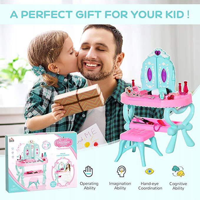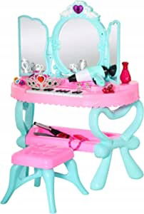 Wymiary stołu: dł. 49,5 x szer. 23 x wys. 66 cm. Wymiary taboretu: dł. 23 x szer. 23 x wys. 18 cm. Nośność: 10 kg (stół), 40 kg (stołek). Uwaga: Lustro i pianino wymagają 3 baterii AA, a suszarka do włosów wymaga 1 baterii AA (brak w zestawie).