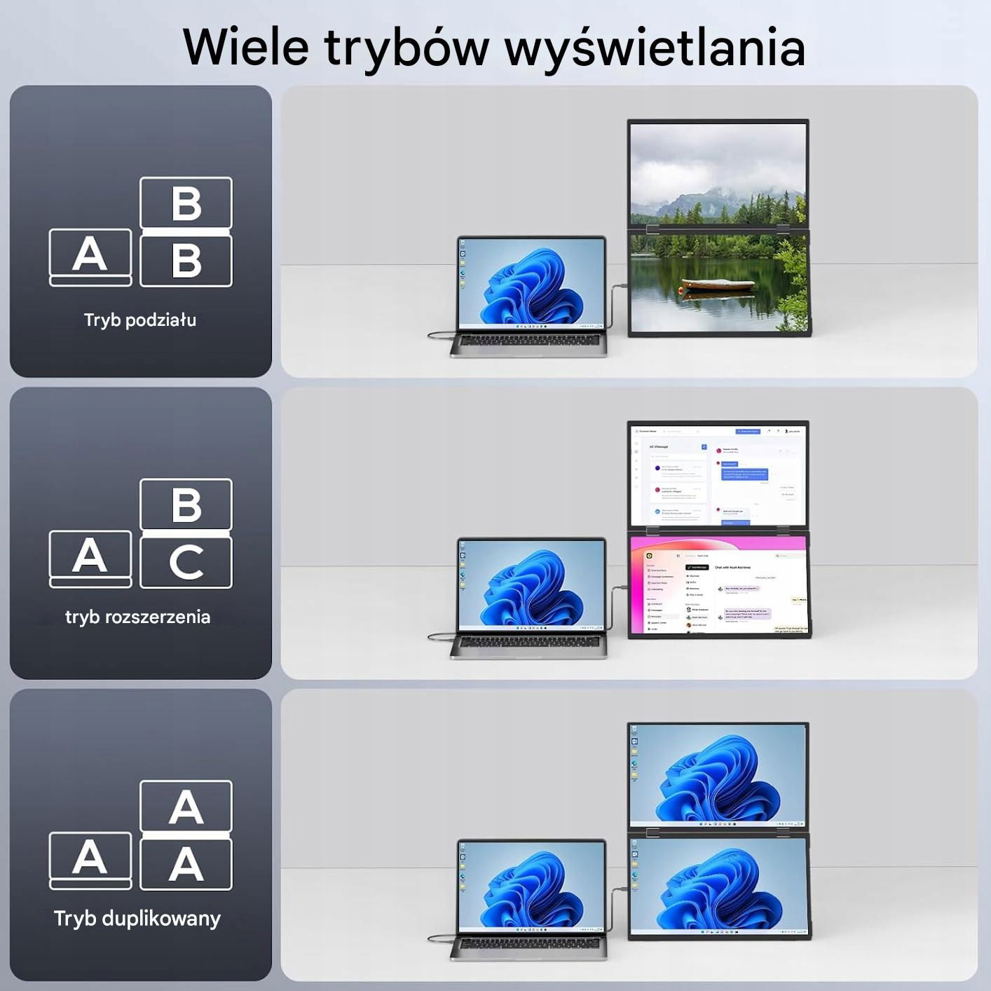 Monitor HONGO to idealne rozwiązanie dla osób mobilnych! Dzięki technologii Plug and Play nie trzeba instalować oprogramowania – wystarczy podłączyć i używać. Monitor wyposażony jest w 3 porty USB-C :