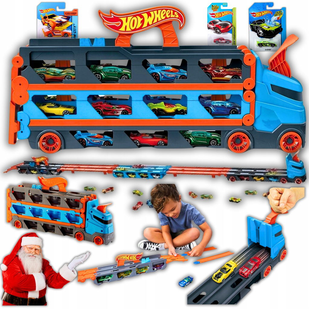 HOT WHEELS DŁUGI TOR WYŚCIGOWY CIĘŻARÓWKA CITY TRANSPORTER 2W1 + 3 AUTKA 2m