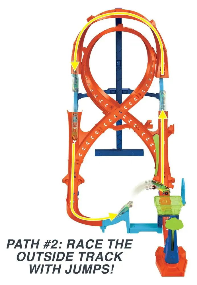 ⭐️Jedna ścieżka wysyła samochód przez krętą figurę 8, podczas gdy druga wysyła go przez zewnętrzny tor w kształcie litery U, który ma 2 skoki kaskaderskie na środku toru.