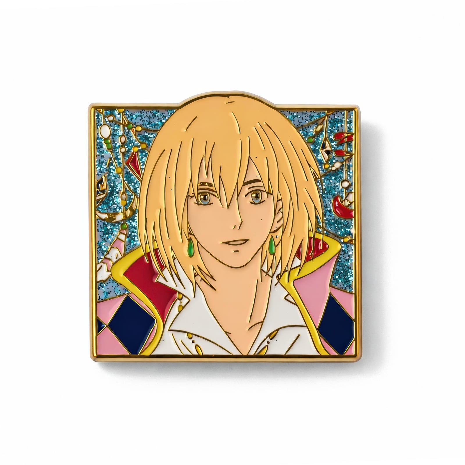 Odkryj urzekający urok tej 3-centymetrowej przypinki z Howlem, starannie wykonanej metalowej ozdoby, która oddaje ikoniczny urok ukochanego czarodzieja ze studia Ghibli. Kwadratowy wzór przedstawia żywy portret Howla, oddany w miękkich odcieniach żółci i kremu dla jego skóry, złotych włosów i subtelnych różowych rumieńców. Jego oczy błyszczą pewną tajemnicą, a jego strój jaśnieje akcentami bieli, złota, różu, błękitu i czerwieni, które odzwierciedlają fantazyjną paletę barw filmu.