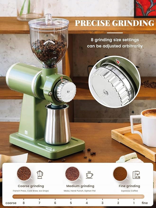 - 【Precyzyjne mielenie i łatwa obsługa】Nasz młynek do ziaren kawy oferuje 8 stopni mielenia, wystarczy ustawić odpowiednią skalę zgodnie z wyświetlaniem na pokrętle i własnymi potrzebami, a proszek można przygotować w kilka sekund.