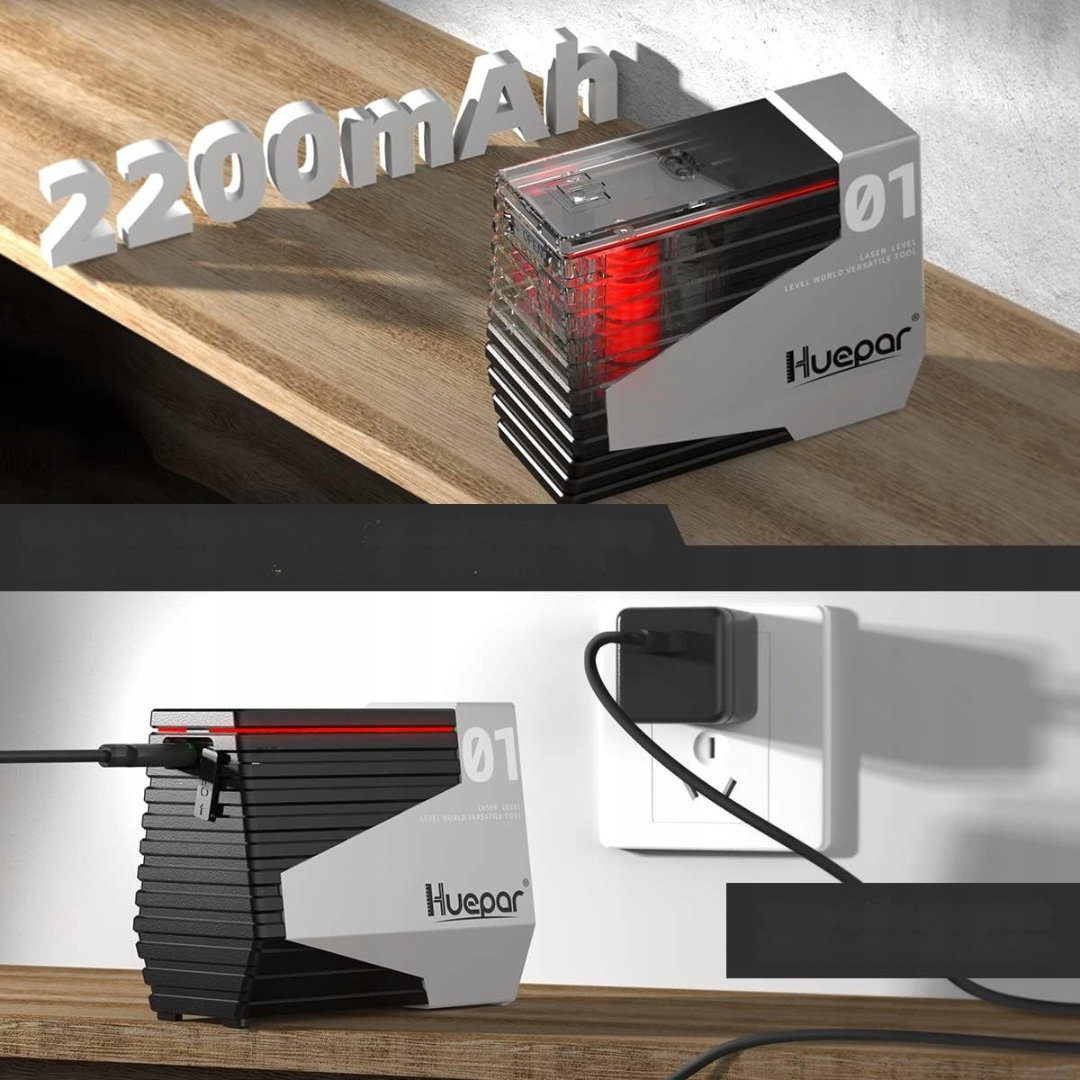 - Akumulator litowo-jonowy 2200 mAh i ładowanie Type-C: poziomica laserowa Huepar E011R korzysta z wbudowanego akumulatora litowo-jonowego 3,7 V / 2200 mAh, który można w pełni naładować w zaledwie 2 godziny. Maksymalny czas pracy wynosi do 20 godzin, co w pełni wystarcza na długi dzień pracy. Port ładowania Type-C umożliwia bezpośrednie podłączenie urządzenia do powerbanka, laptopa lub innego źródła USB, co zapewnia wygodne i elastyczne ładowanie w każdych warunkach.