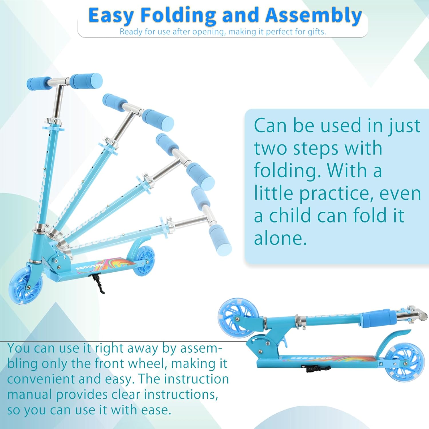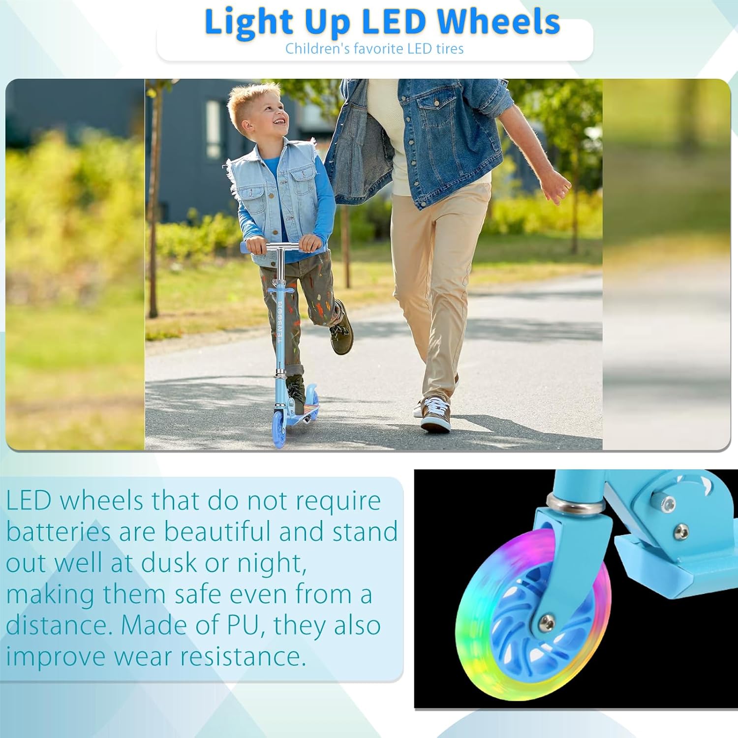 - 【Łatwy do złożenia i przenoszenia】System składania hulajnogi dla dzieci pozwala na złożenie jej w 3 sekundy. Lekka aluminiowa rura w kształcie litery T i deska do kopania sprawiają, że ta świecąca hulajnoga zapewni Twojemu dziecku łatwiejszą i bezpieczniejszą jazdę.