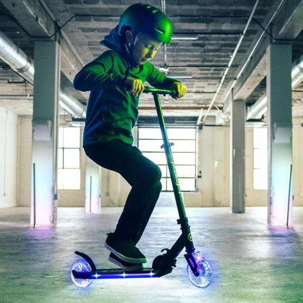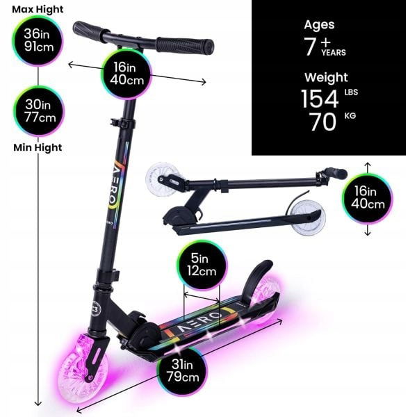 Aero C3 to składana hulajnoga dziecięca z nowoczesnym podświetleniem RGB, które można dowolnie zmieniać w aż 7 kolorach i 3 trybach. Solidna aluminiowa rama sprawia, że hulajnoga jest lekka, a jednocześnie wytrzymała – idealna do codziennych przejażdżek. Regulowana wysokość kierownicy pozwala dopasować ją do wzrostu dziecka, dzięki czemu posłuży na dłużej.