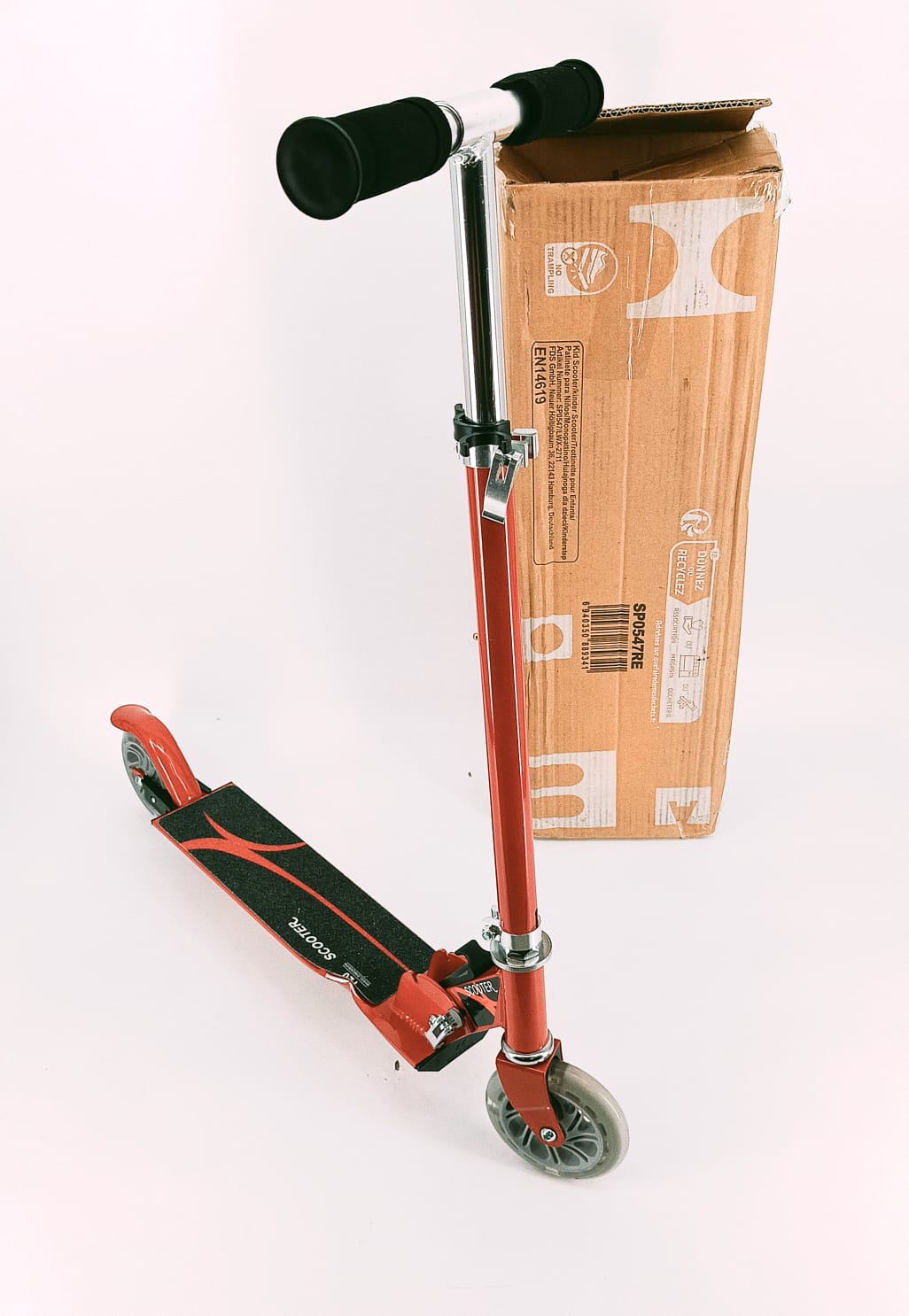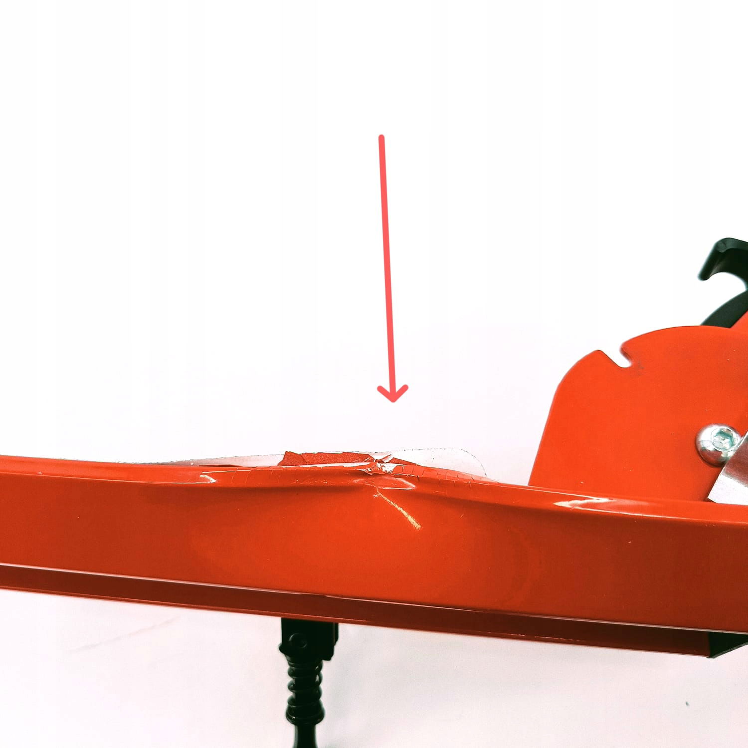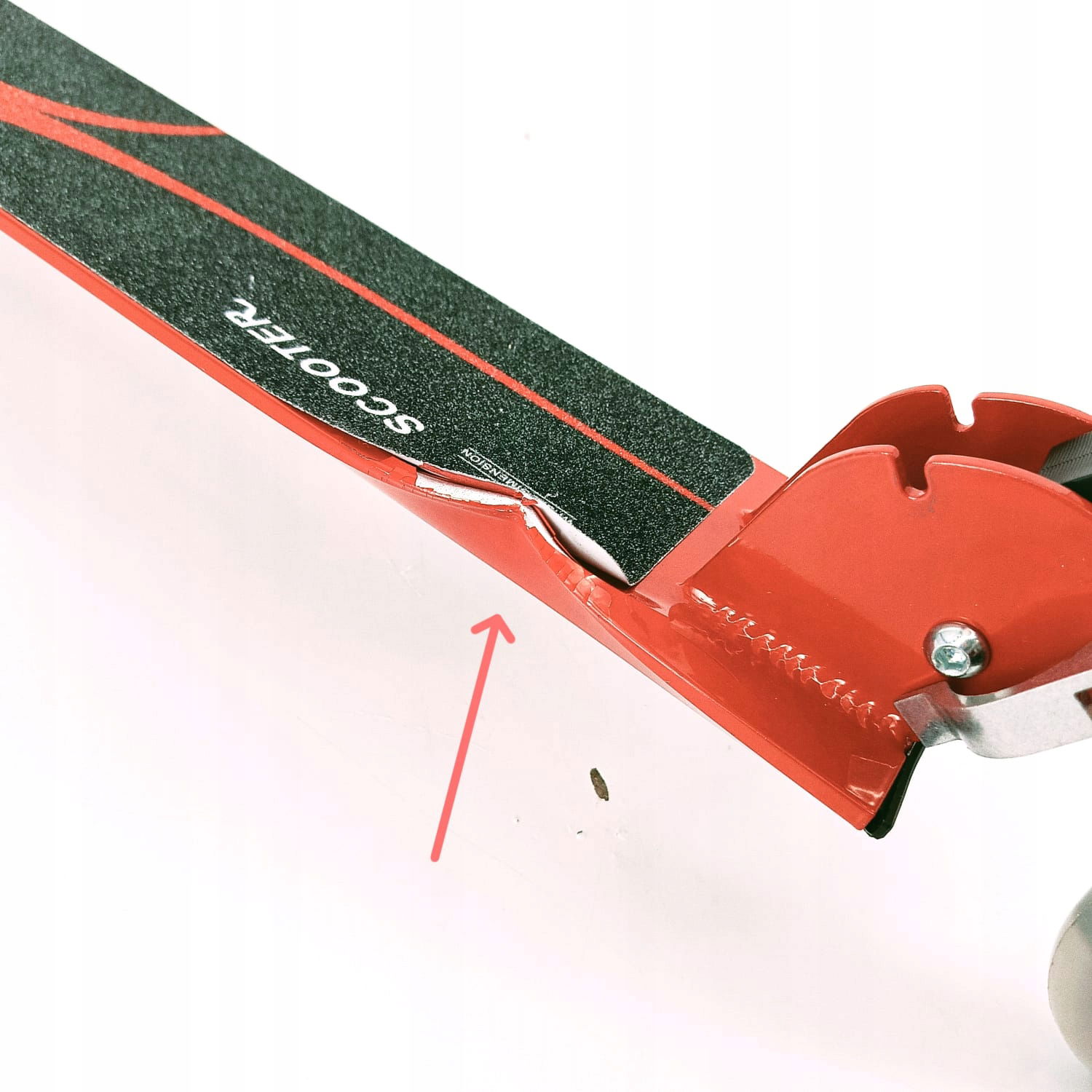 STAN: Uszkodzone. Hulajnoga uszkodzona w transporcie. Posiada wgniecenie oznaczone na zdjęciach czerwona strzałką.(Defekt jest jeden zrobiony z różnych ujęć) Poza tym hulajnoga nieużywana. Podniszczone opakowanie