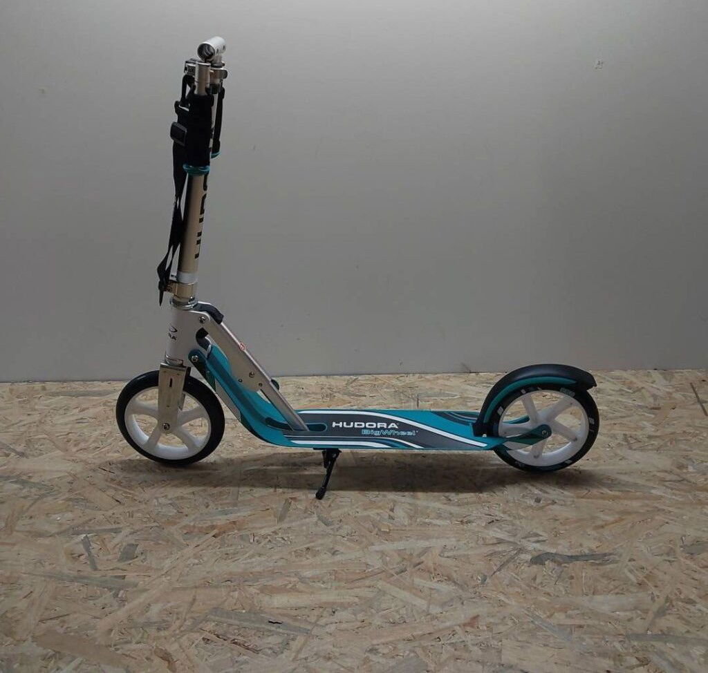 Składana, aluminiowa hulajnoga marki Hudora z dużymi kółkami ułatwiającymi szybszą jazdę