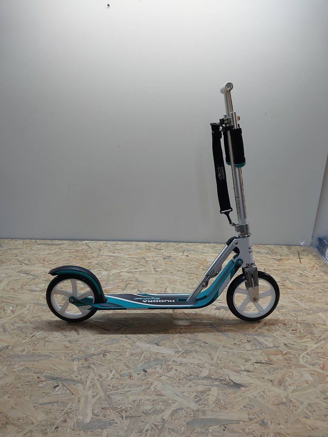 Składana, aluminiowa hulajnoga marki Hudora z dużymi kółkami ułatwiającymi szybszą jazdę