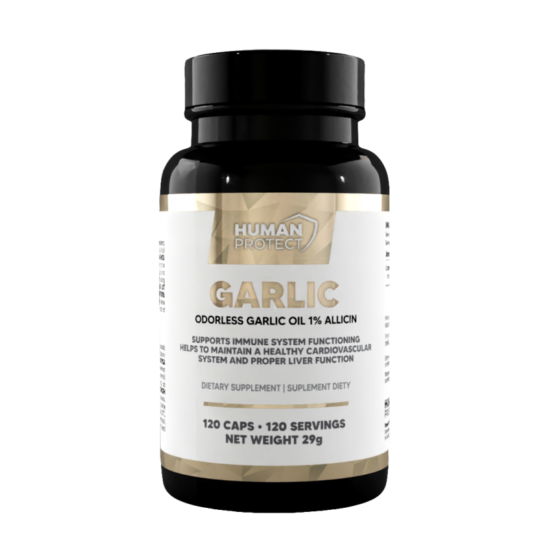 Human Protect Garlic Odorless to suplement diety w formie bezzapachowych kapsułek, zawierający skoncentrowany ekstrakt z czosnku, który jest powszechnie ceniony za swoje właściwości prozdrowotne. Czosnek od wieków był używany jako naturalny środek wspierający układ odpornościowy oraz krążeniowy, a jego bezzapachowa forma zapewnia komfort suplementacji bez nieprzyjemnego zapachu.