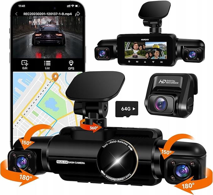 ?HUPEJOS Dash Cam V90-4CH to wszechstronny rejestrator samochodowy nowej generacji, który zapewnia pełną ochronę i kontrolę nad Twoim pojazdem. Dzięki ultra szerokim kątom widzenia, urządzenie monitoruje cztery pasy ruchu jednocześnie, nagrywając obraz w rozdzielczości 4K z przedniej kamery oraz 1080P z trzech dodatkowych kamer.