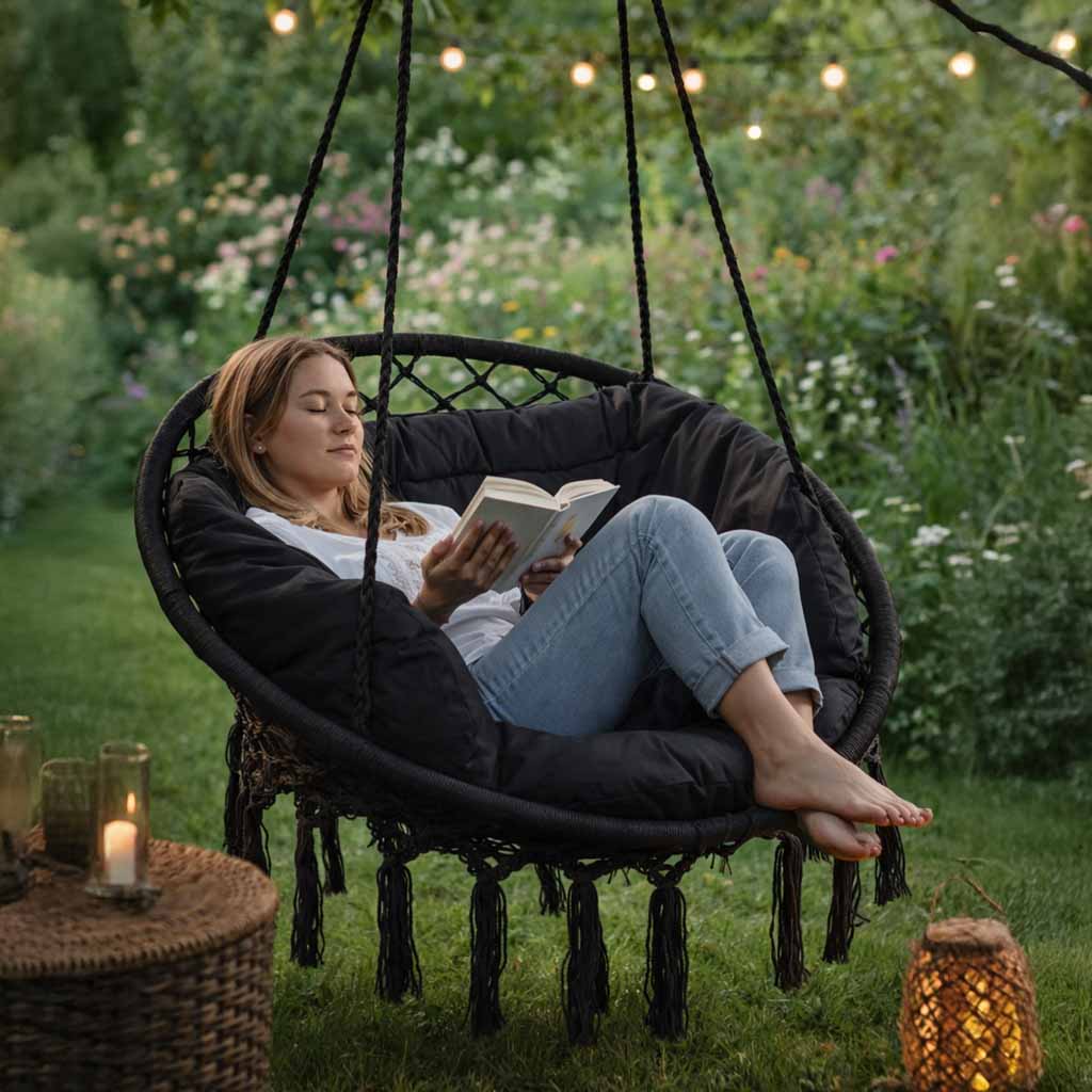 DO DOMU, OGRODU I NA TARAS - Huśtawkę można zawiesić w różnych miejscach, dzięki czemu łatwo dopasować ją do przestrzeni i własnych potrzeb. Dobrze prezentuje się w salonie, sypialni, na tarasie oraz w ogrodzie. Jej nowoczesna forma i stonowany kolor pomagają wkomponować ją zarówno w przytulne wnętrza, jak i w strefę wypoczynku na świeżym powietrzu, tworząc przyjemne miejsce do codziennego użytkowania.