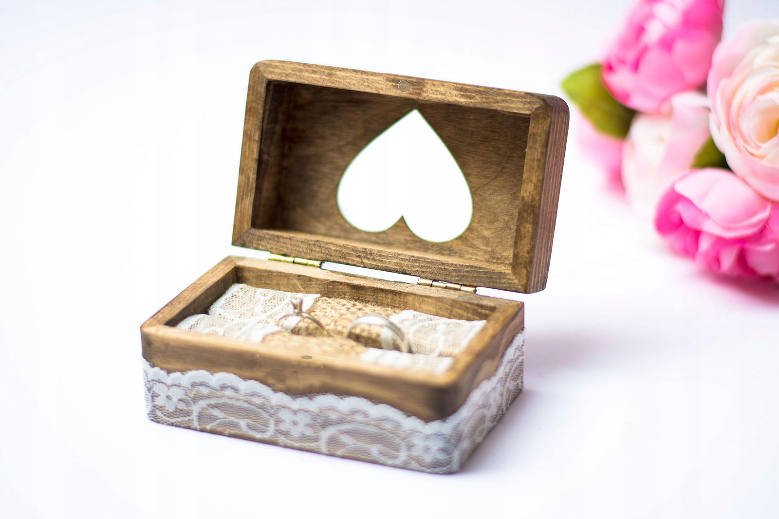 Hwart drewniane pudełko na pierścionek ? to stylowy i elegancki dodatek do ceremonii ślubnej czy zaręczyn ?. Wykonane z naturalnego drewna ? i wykończone elementami z poliuretanu, prezentuje się w klimacie vintage ✨. Wewnątrz wyłożone jutą, bezpiecznie przechowuje biżuterię, a praktyczny zamek ? chroni zawartość. Idealne do przechowywania pierścionka zaręczynowego lub obrączek.